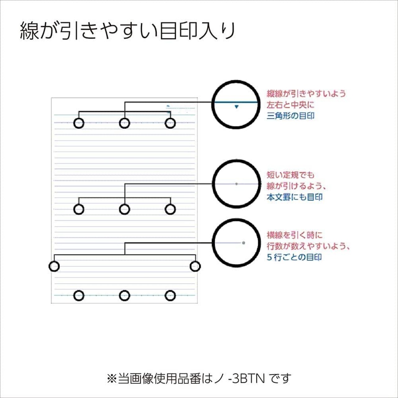 使いやすく工夫した罫内容/キャンパスノートと同じようにタテ線が正確に引けるよう、センターと左端に三角形のメモリ点を配置しました。