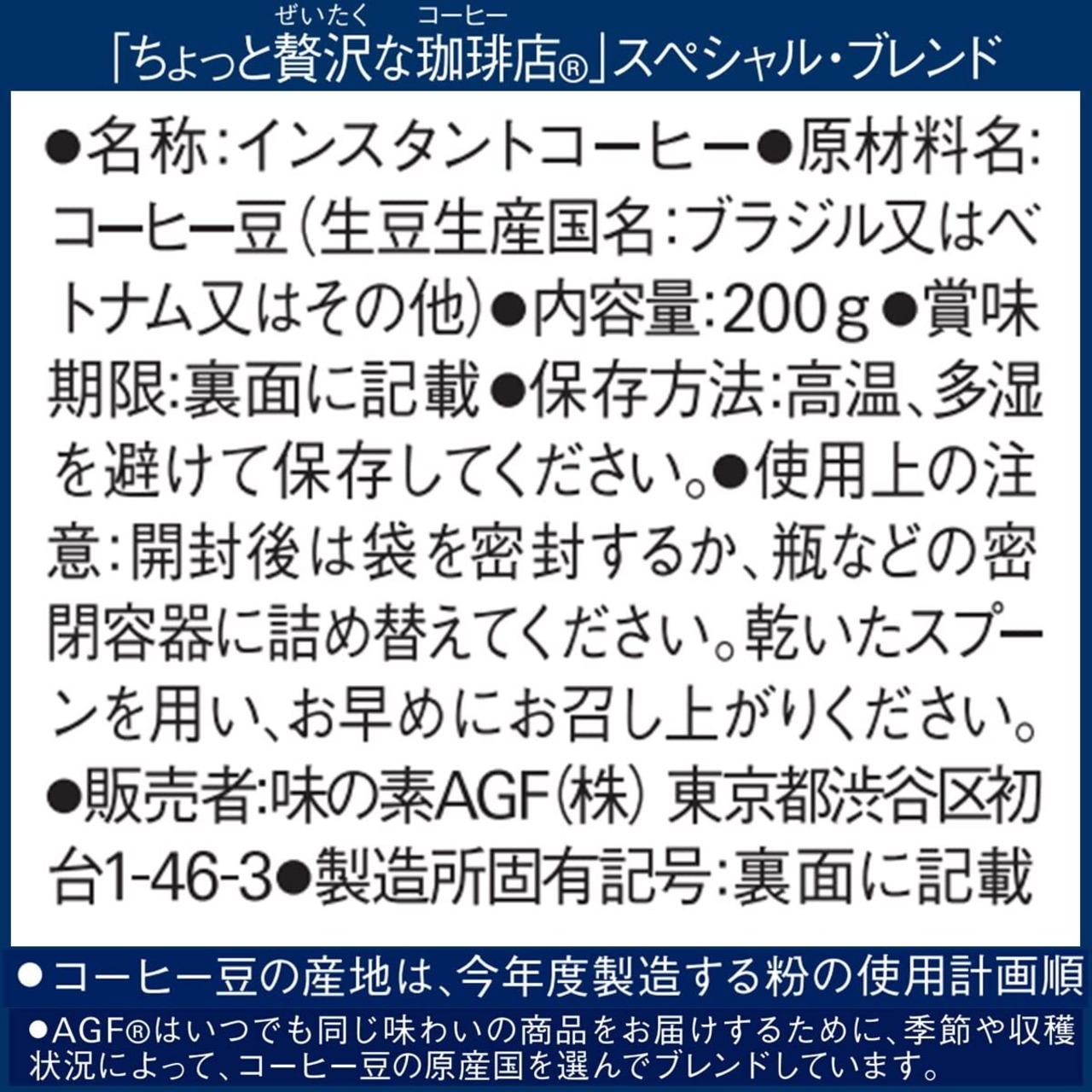 AGF(エージーエフ) 「ちょっと贅沢な珈琲店」 スペシャル・ブレンド袋200gは、ブラジル産最上級グレード豆タイプ2の特徴を活かした濃く芳醇な香りと深いコクのちょっと贅沢な珈琲店 インスタントコーヒー スペシャル・ブレンド袋入り大容量詰め替えタイプです。詰め替え用(エコパック)