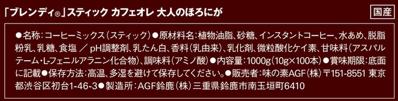 原材料:クリーミングパウダー(乳成分を含む)(国内製造)、インスタントコーヒー、砂糖、食塩 / pH調整剤、乳たん白、香料(乳由来)、乳化剤、甘味料(アスパルテーム・L-フェニルアラニン化合物、アセスルファムK)、微粒酸化ケイ素、調味料(アミノ酸等)