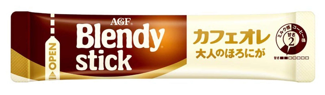 カフェオレ大人のほろにが専用のコーヒー、ミルク、砂糖のベストバランスを考えて特殊なミキサーで混合。いつでも変わらないおいしさを実現したスティックコーヒーです。甘さレベル2(AGF ブレンディ スティック カフェオレ比較)