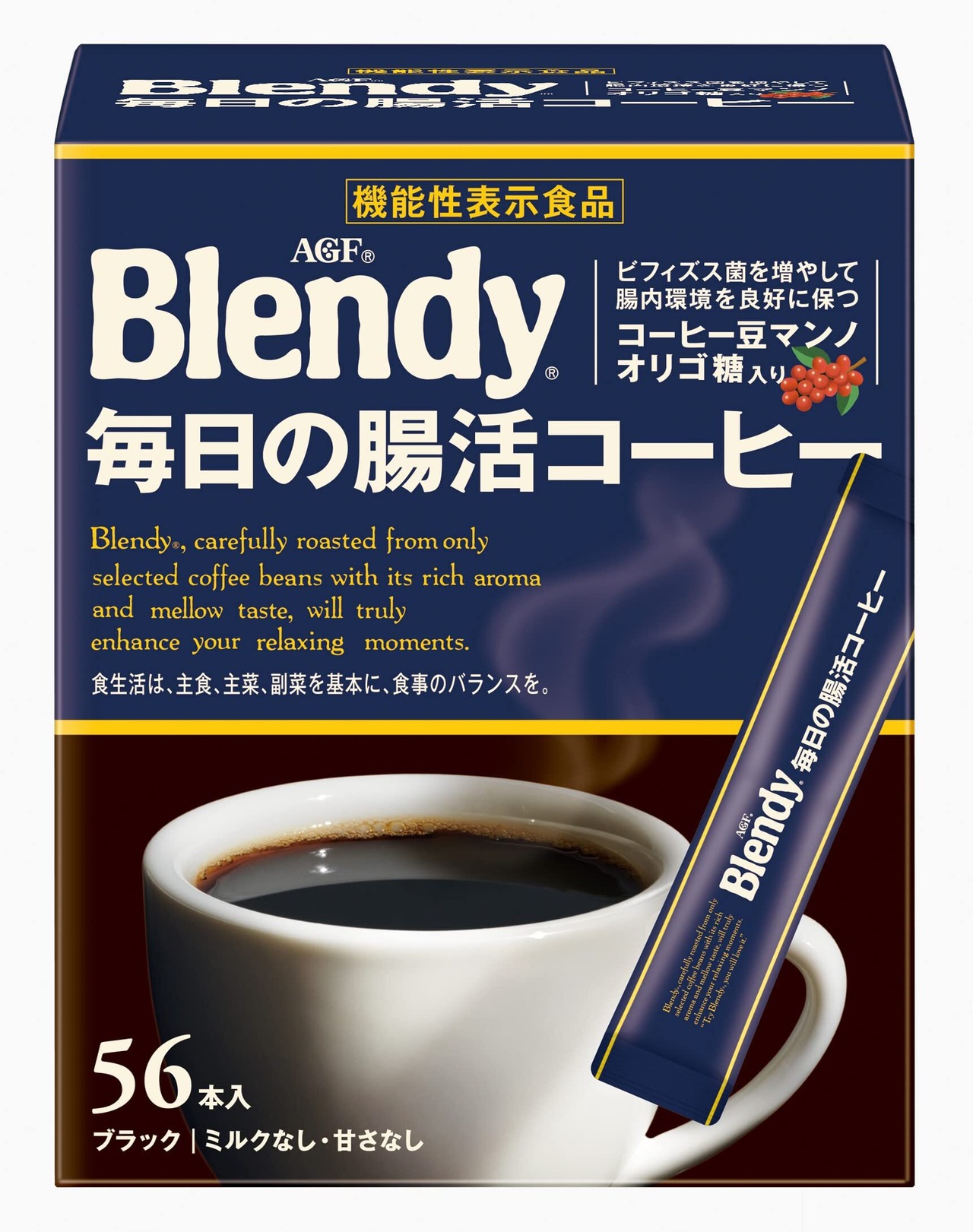 AGF(エージーエフ) 「ブレンディ」 スティックブラック 毎日の腸活コーヒー56本は、いつもの「ブレンディ」の味わいはそのままに、ビフィズス菌を増やして腸の動きを活発にし腸内環境を良好に保つコーヒー豆マンノオリゴ糖入りの機能性表示食品です。1杯1杯がいつも新鮮な個包装スティックコーヒー(ブラック、ミルクなし、甘さなし)タイプ。