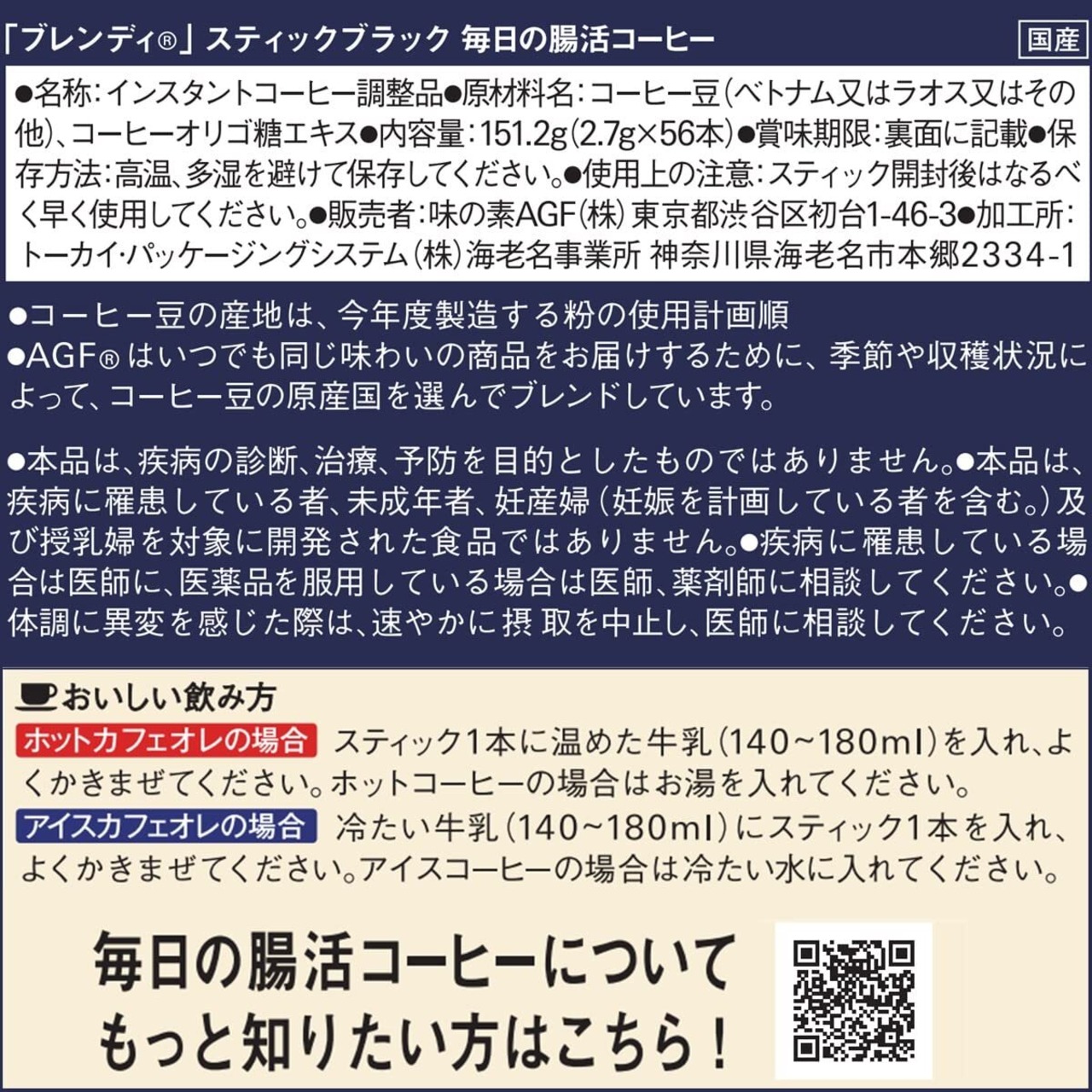 おいしい飲み方:【ホットカフェオレ】:スティック1本に温めた牛乳を入れ、よくかきまぜてください。ホットコーヒーの場合はお湯を入れてください【アイスカフェオレ】:冷たい牛乳にスティック1本を入れ、よくかき混ぜます。アイスコーヒーの場合は冷たい水に入れてください※一日摂取目安量1日2回、スティック1本(2.7g)、飲みすぎ、あるいは体質・体調により、お腹がゆるくなる場合があります
