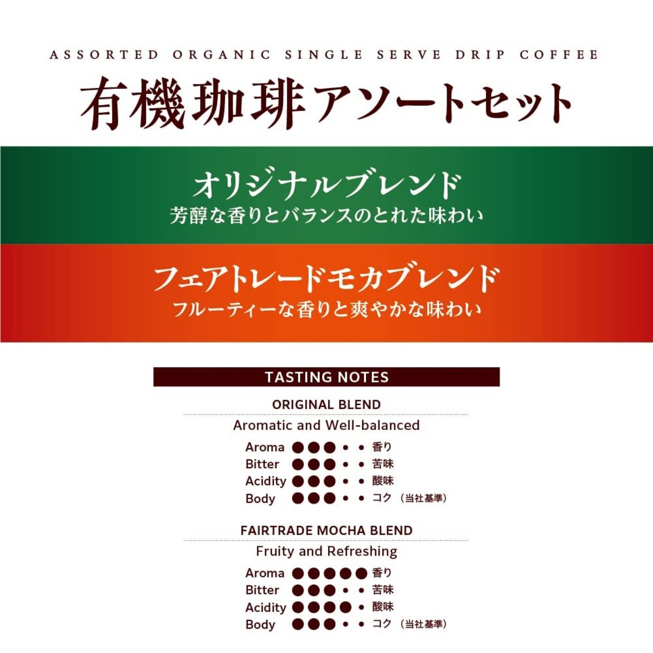 小川珈琲の有機シリーズをアソートでお楽しみいただけます。【オリジナルブレンド】芳醇な香りとバランスのとれた味わい【フェアトレードモカブレンド】フルーティーな香りと爽やかな味わい 原材料・成分 コーヒー豆