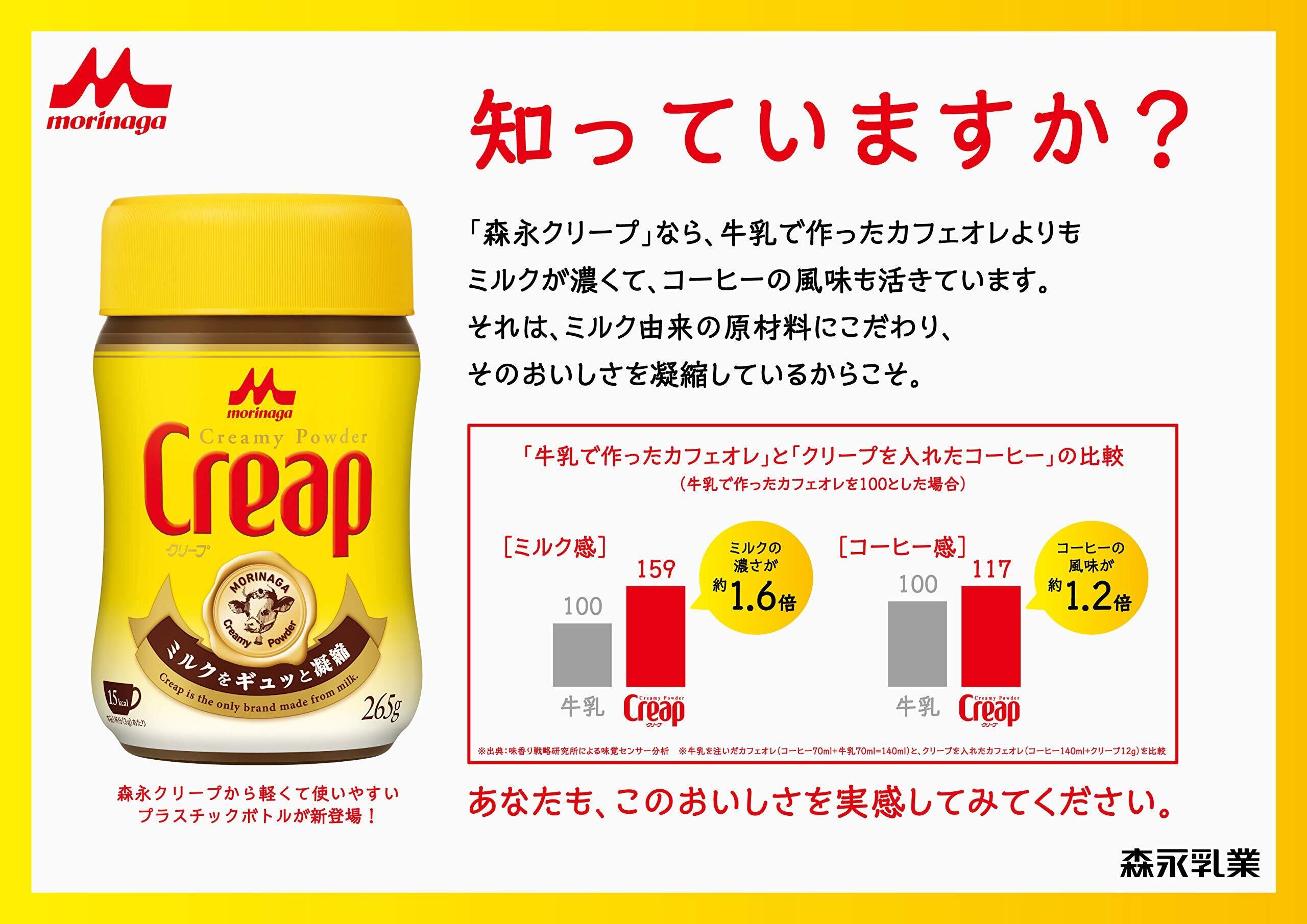 森永クリープは、日本で唯一、ミルクから生まれた成分を原料にしたクリーミングパウダーです(※2023年7月時点 森永乳業調べ)当社独自の技術によって、香料や着色料を使わない製法を実現しています。便利なスティックタイプ。豊かなコクがコーヒーの美味しさをより一層引き立てます。牛乳から生まれた成分で出来ているので、温かいコーヒーを冷まさずに楽しむことができます。その他にもお菓子やカレー、シチューのコク出しなど幅広く使えます。コーヒーポーション・ミルクポーションの代わりに。