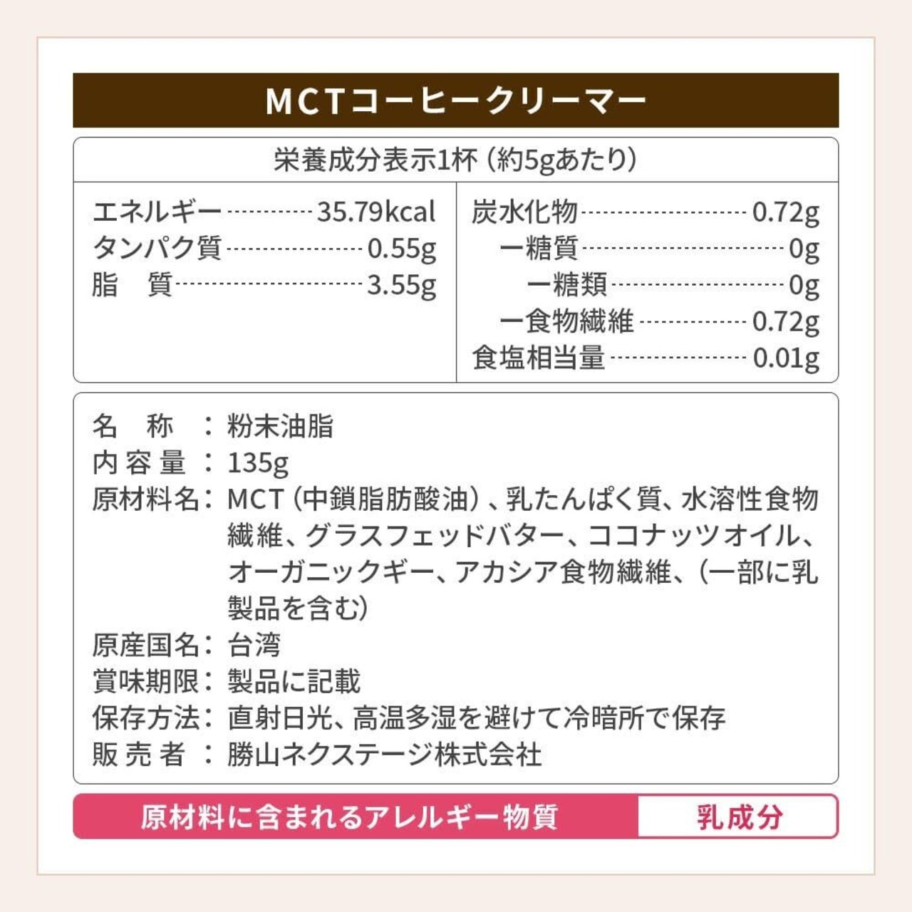 商品の1番の特徴は「MCTオイル」の量。ケトジェニックダイエット・置き換えダイエットをしたい人が満足できるよう、1杯あたり2150mgのMCTオイルを配合。他にも、グラスフェッドバター・オーガニックギー・ココナッツオイルといった、ケトジェニックに欠かせない良質な脂質を配合。手作りのバターコーヒーの味が再現できる配合にこだわっています。