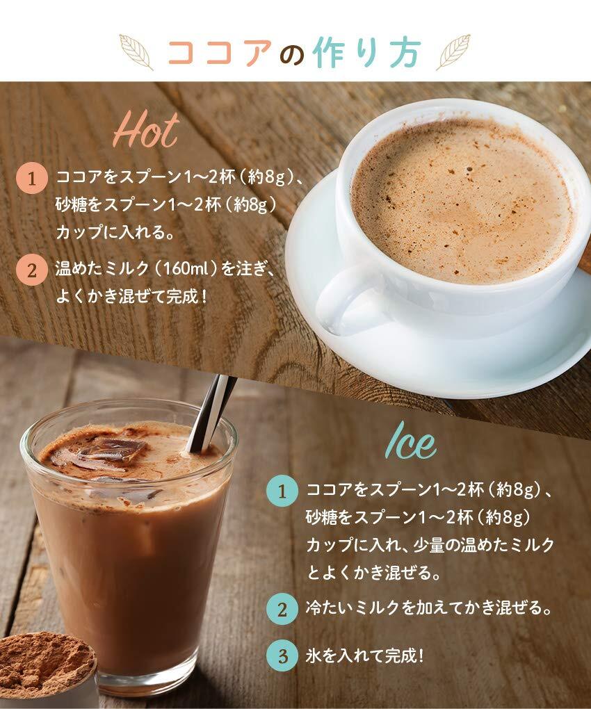 【お召し上がり方】毎日の飲用ココアとして、温かいミルクやお湯に溶かしてお楽しみください。また、お菓子作りや料理の隠し味としても活用でき、幅広いレシピに対応します。