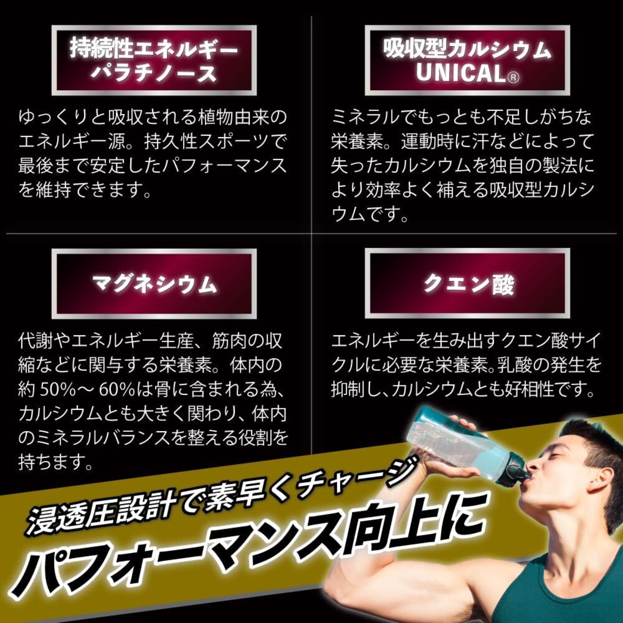 水分・ミネラル・エネルギー・ビタミンを浸透圧設計で素早くチャージ!持久性エネルギー<パラチノース>、吸収型カルシウム<ユニカル>、マグネシウム、クエン酸など10種類の栄養素を配合。