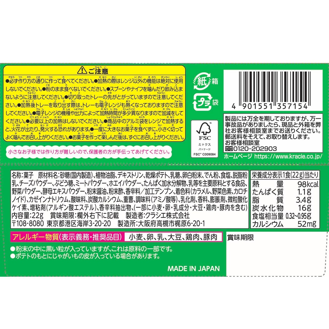 砂糖(国内製造)、植物油脂、デキストリン、乾燥ポテト、乳糖、卵白粉末、でん粉、食塩、脱脂粉乳、チーズパウダー、ぶどう糖、ミートパウダー、ホエイパウダー、たんぱく加水分解物、乳等を主要原料とする食品、野菜パウダー、酵母エキスパウダー、粉末醤油、粉末酢、香辛料/加工デンプン、着色料(カラメル、野菜色素、カロチノイド)、カゼインナトリウム、酸味料、炭酸カルシウム、重曹、調味料(アミノ酸等)、乳化剤、香料、膨脹剤、微粒酸化ケイ素、増粘剤(アルギン酸エステル)、香辛料抽出物、(一部に小麦・卵・乳成分・大豆・鶏肉・豚肉を含む)