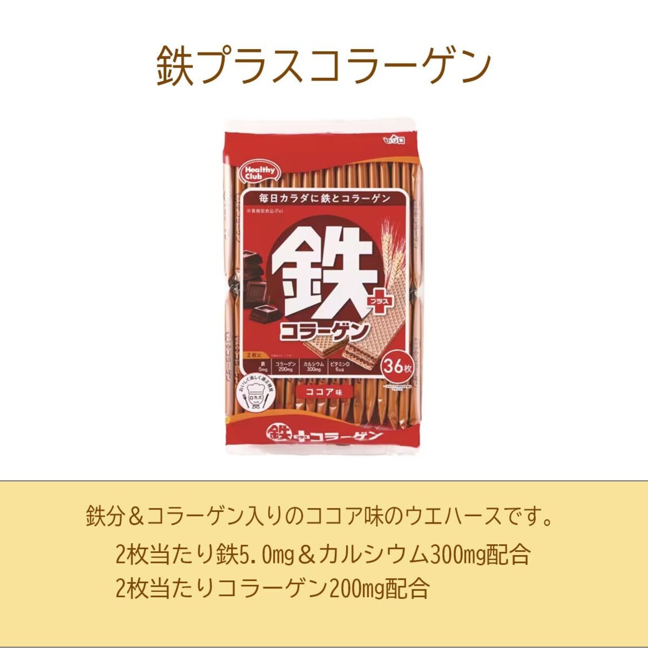 【36枚鉄プラスコラーゲンウエハース】鉄分&コラーゲン入りのココア味のウエハースです。2枚当たり鉄5.0mg&カルシウム300mg配合/2枚当たりコラーゲン200mg配合