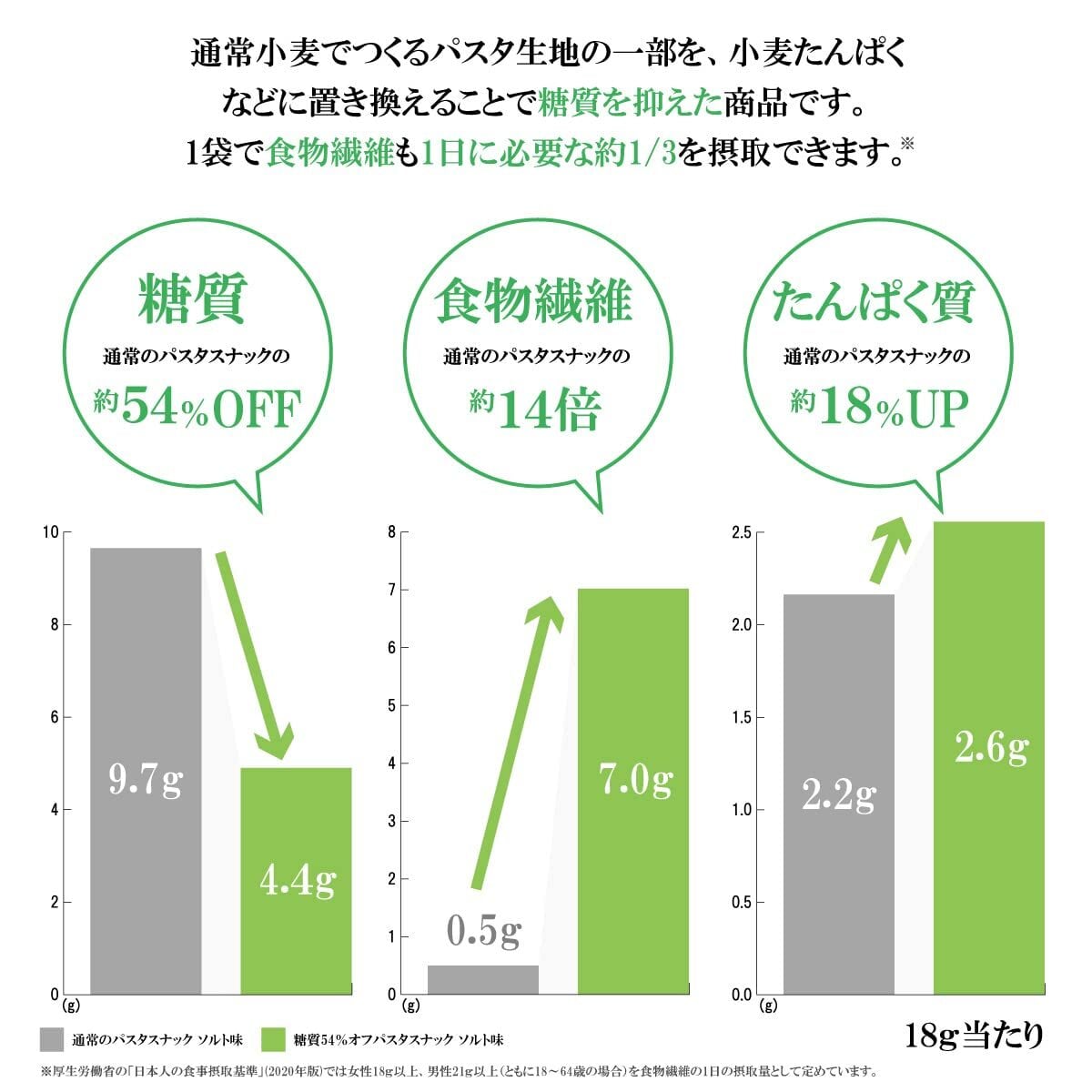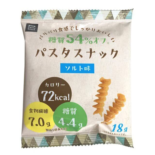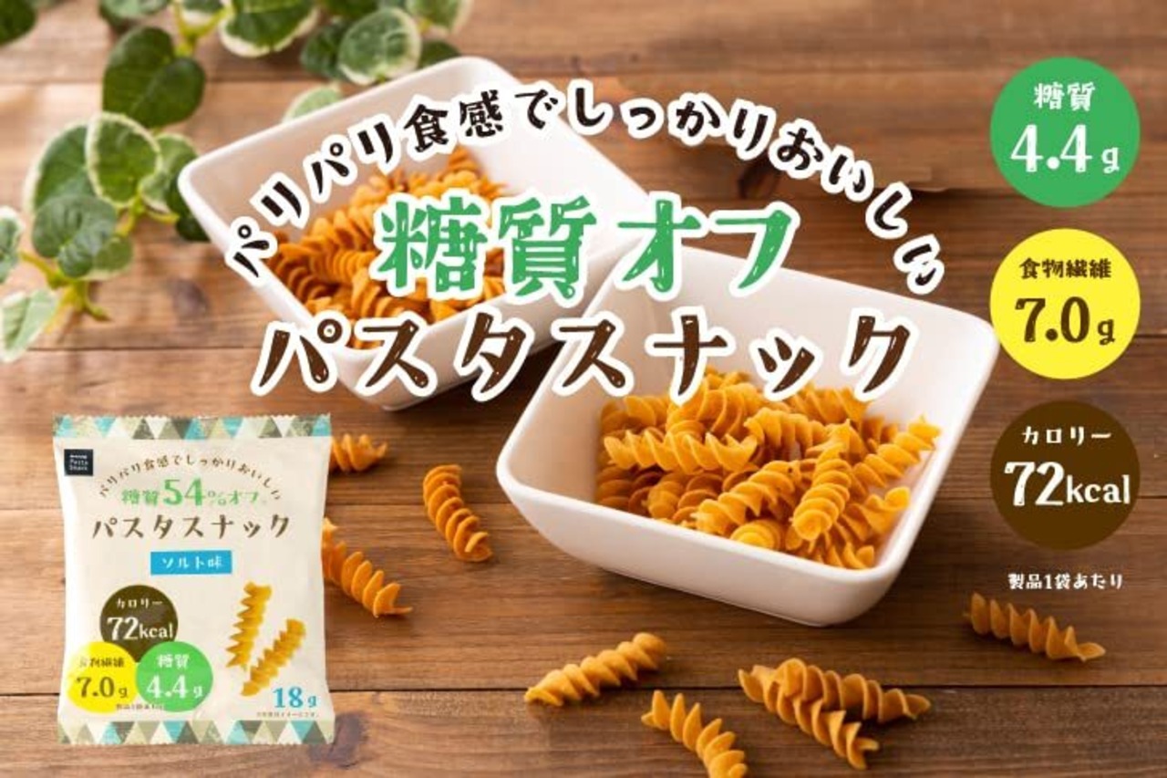 パリパリ食感でしっかりおいしい 糖質54%オフ(※) パスタスナック。1袋(18g) 食べても糖質4.4g、カロリー72kcal、食物繊維は7.0g (※)当社の一般的なパスタスナック(ソルト味)と比べ、糖質を54%低減しています。