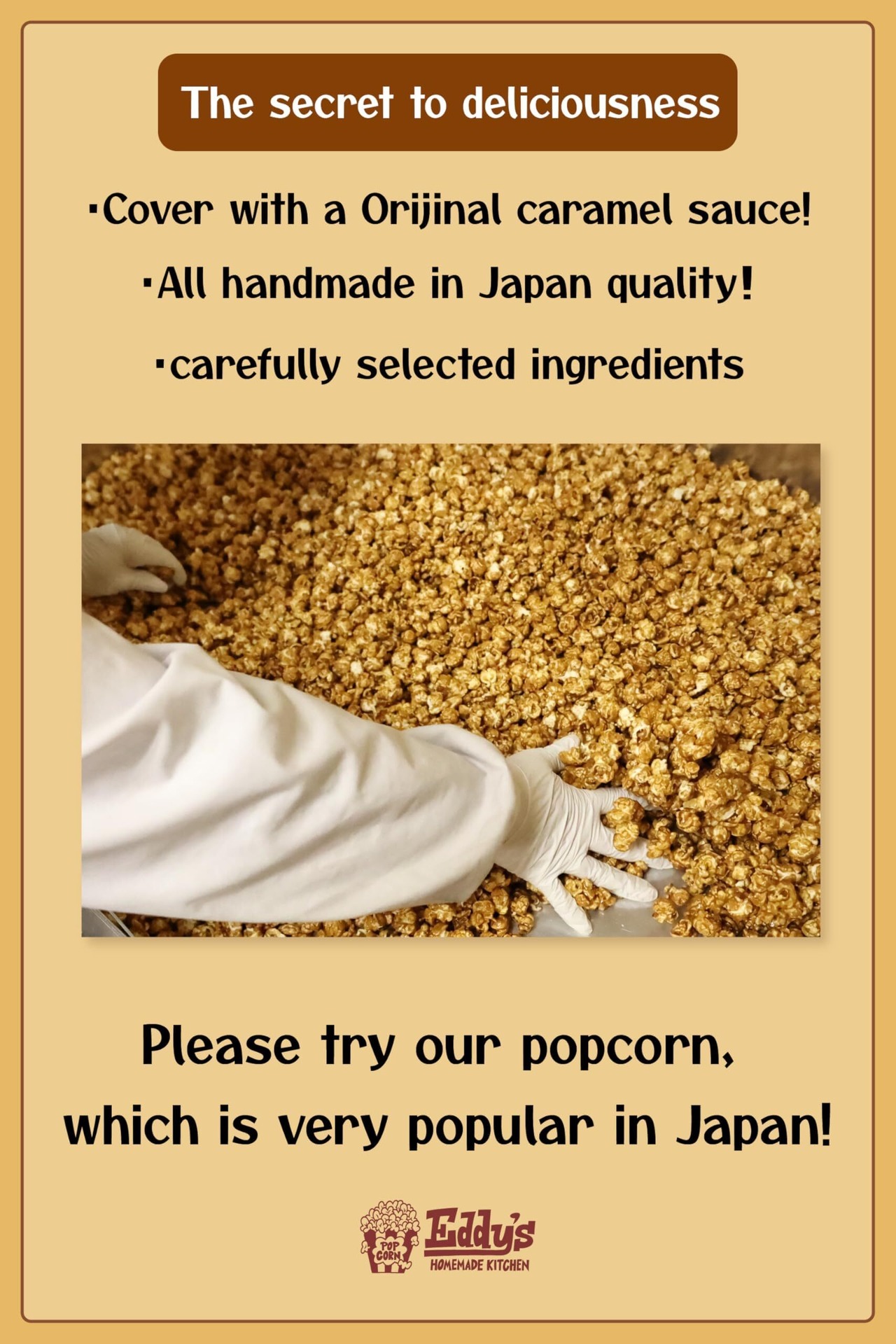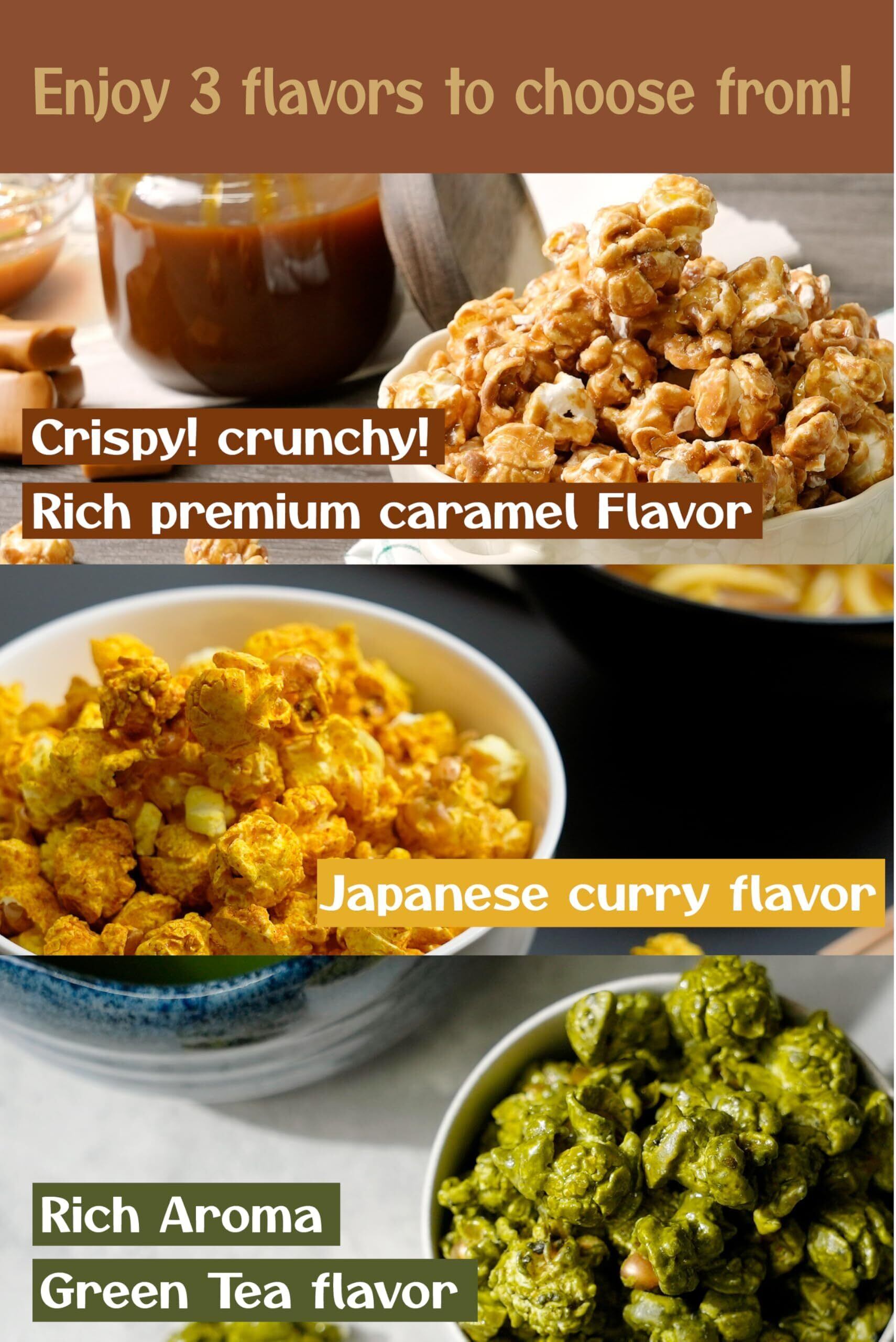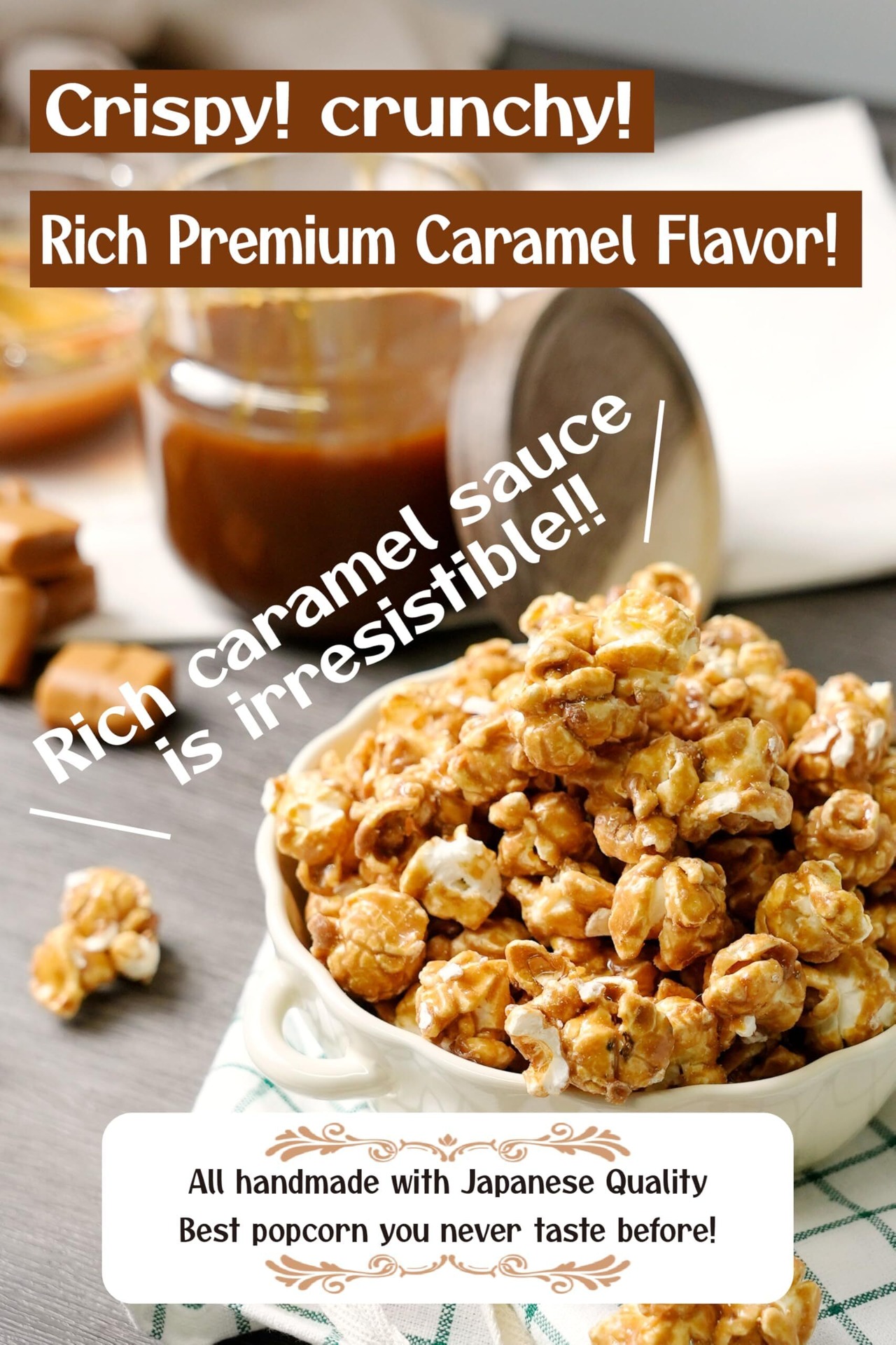 【少量でも大満足な濃厚ポップコーン】ふっくら弾けるマッシュルームコーンに濃厚なソースをたっぷりコーティング。表面はカリッと、中はサクッと。甘くてほろ苦い味と楽しい食感で食べ出したら止まらない!