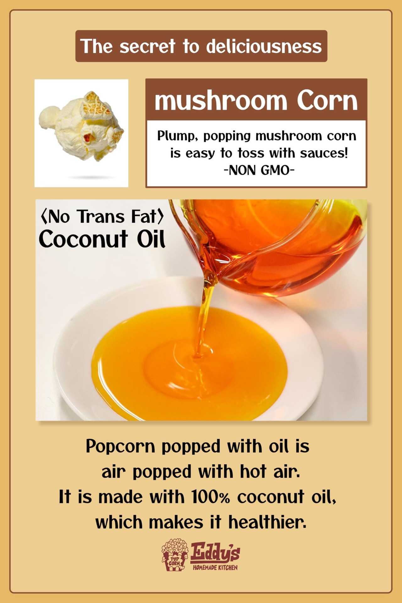 【100%ココナッツオイル使用だからとってもヘルシー】ココナッツオイルを使用してコーン豆を丁寧に弾いてます。他の油で作ったポップコーンとのコクと旨味の違いをお楽しみください。