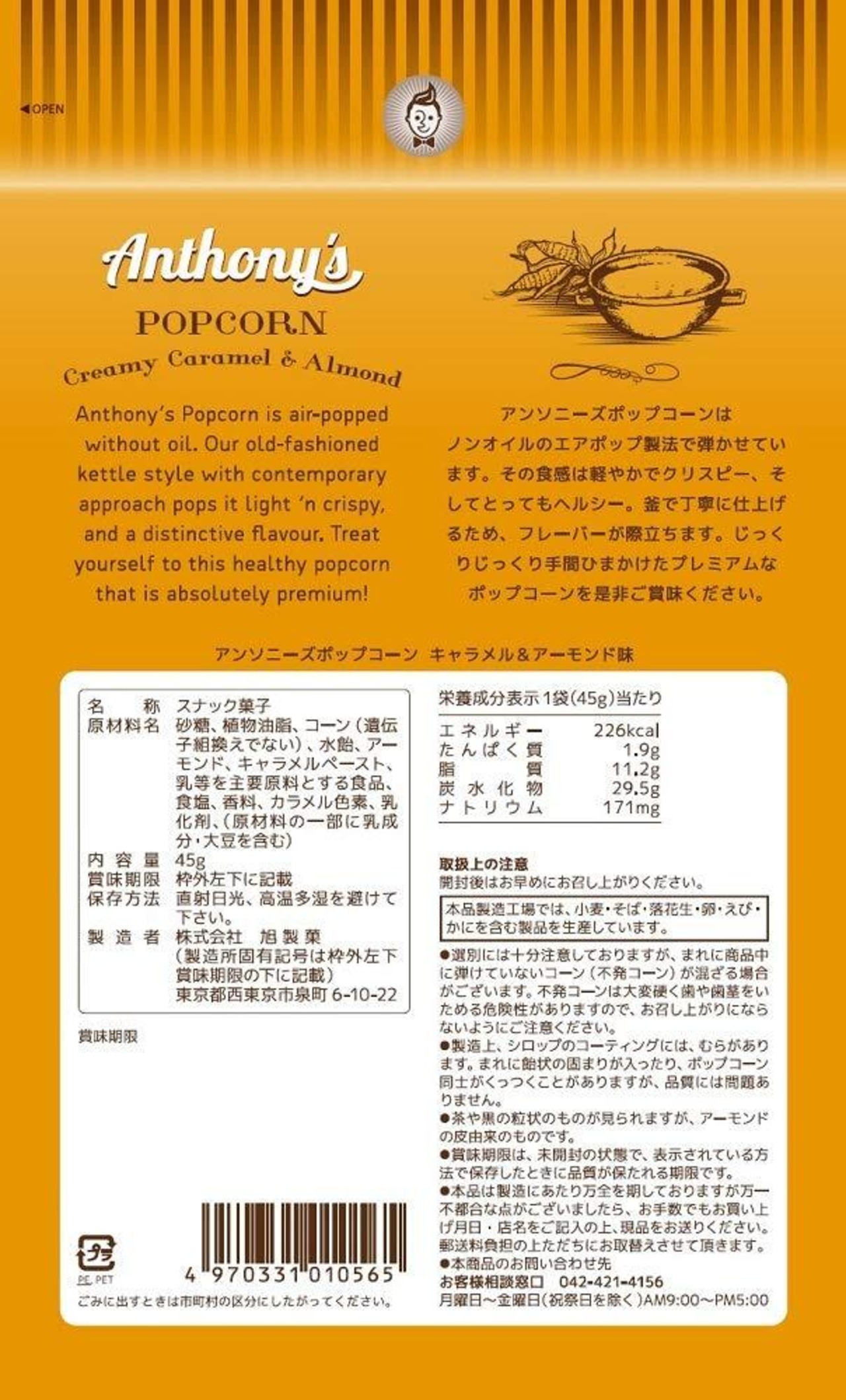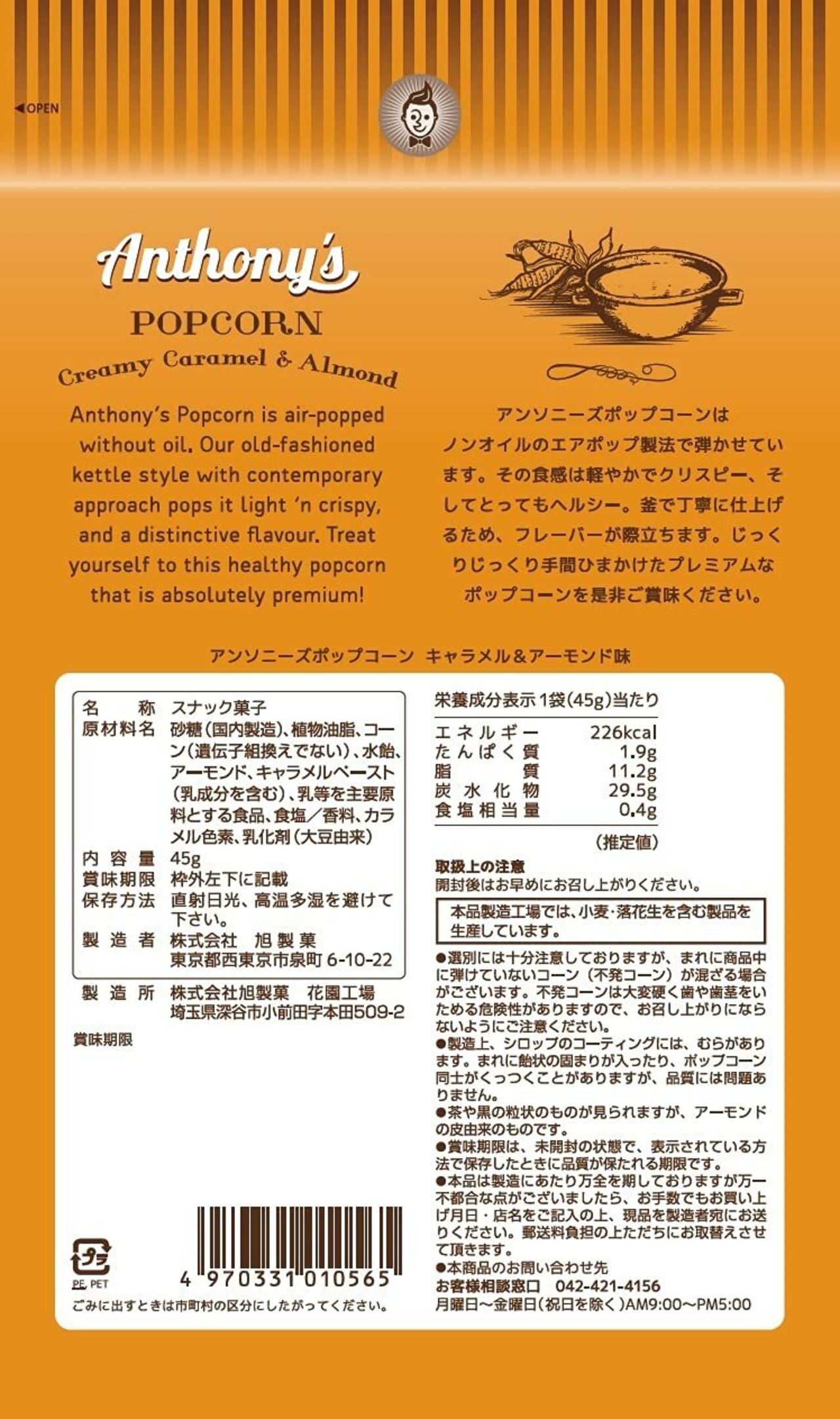 旭製菓 アンソニーズポップコーンキャラメル&アーモンド味 45g×3袋