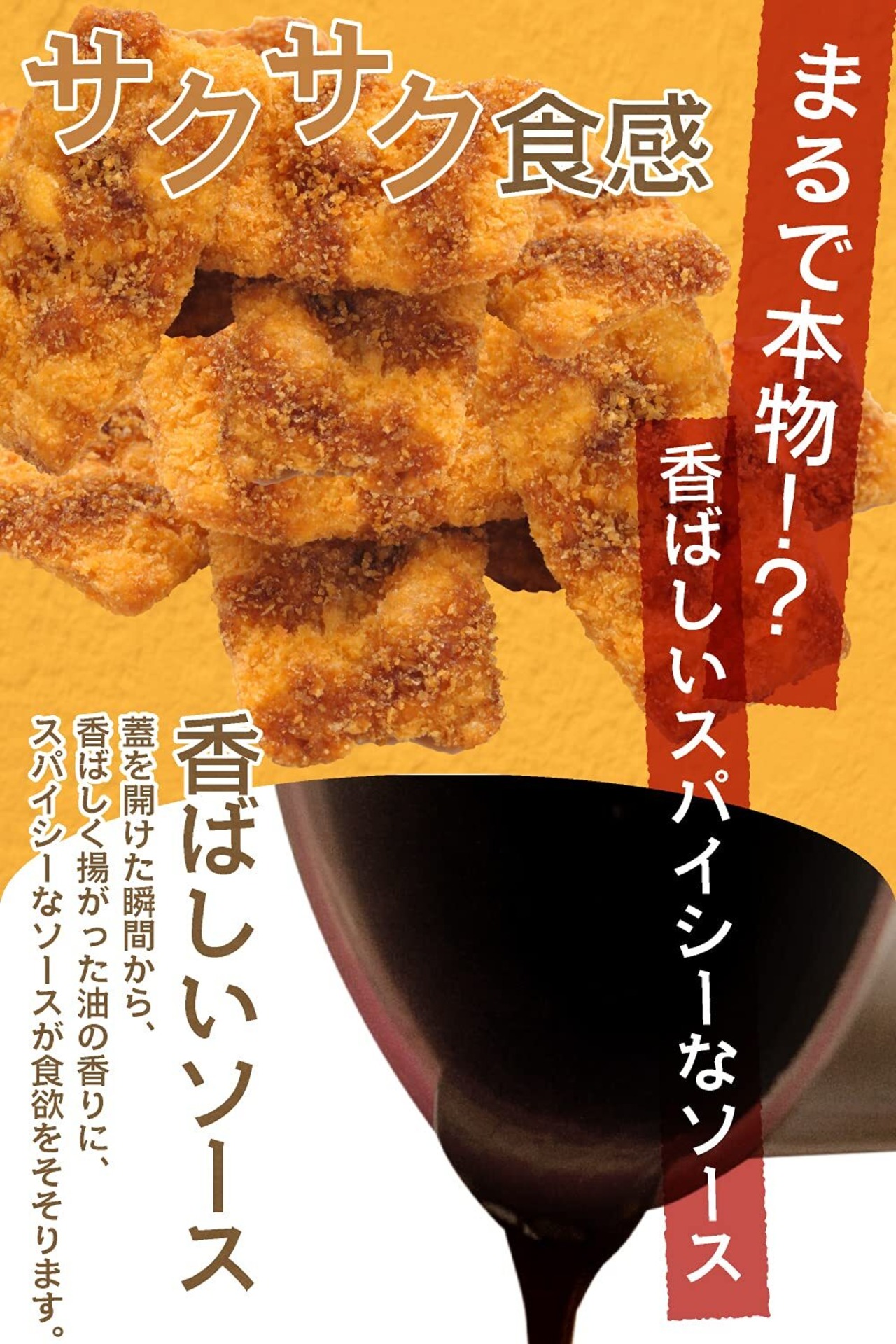 【原材料】植物油、パン粉、小麦粉、濃厚ソース、魚肉シート(魚肉すり身、全卵、植物性たん白、でん粉、植物油、食塩、香辛料)、でん粉、香辛料、卵白、たん白加水分解物、植物性たん白、食塩/ソルビトール、グリセリン、加工でん粉、調味料(アミノ酸等)、トレハロース、膨張剤、着色料(カラメル、カロチノイド)、増粘剤(加工でん粉、タマリンド)、甘味料(カンゾウ)、(一部に小麦・卵・大豆・鶏肉・豚肉・もも・りんごを含む)