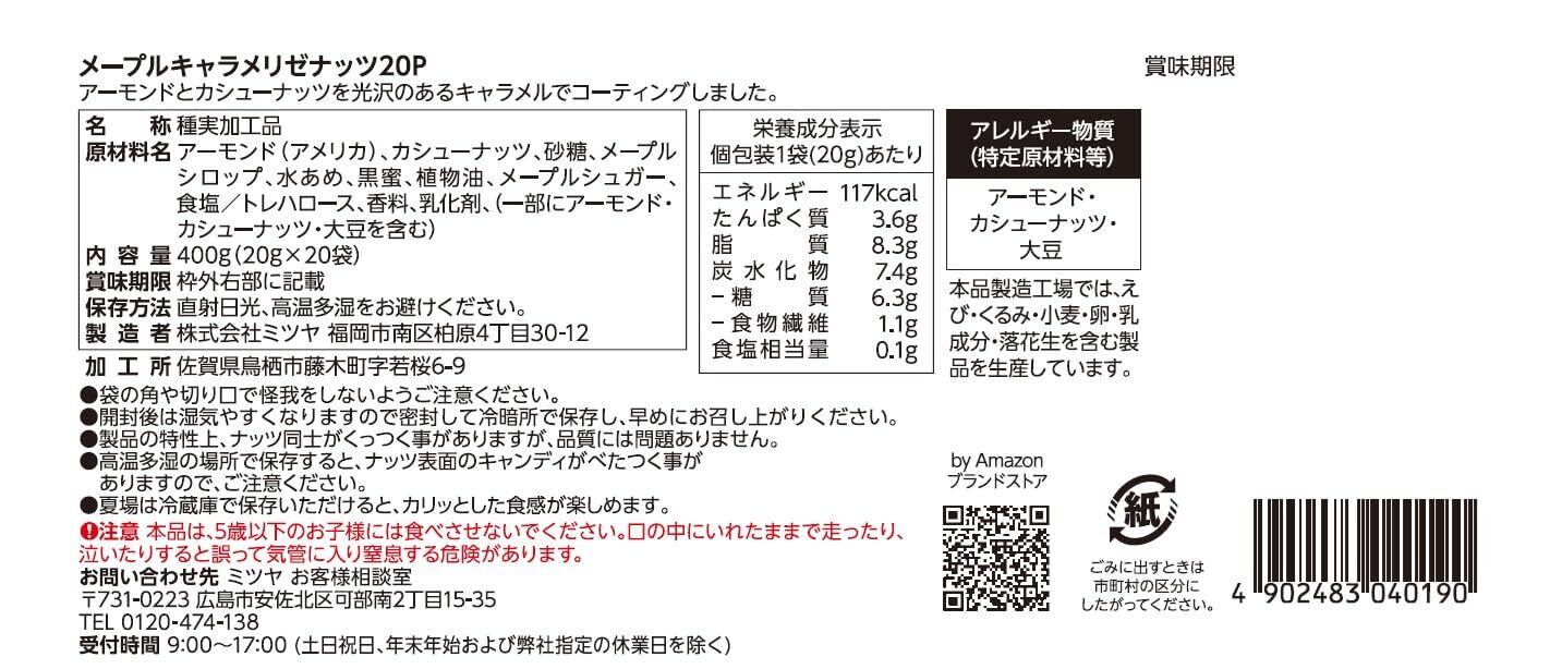 原材料:アーモンド(米国)、カシューナッツ、砂糖、メープルシロップ、水あめ、黒蜜、植物油、メープルシュガー、食塩/トレハロース、香料、乳化剤、(一部にアーモンド・カシューナッツ・大豆を含む)栄養成分表示個装1袋(20g)あたり:エネルギー117kcal たんぱく質3.6g 脂質8.3g 炭水化物7.4g 糖質6.3g 食物繊維1.1g 食塩相当量0.1g