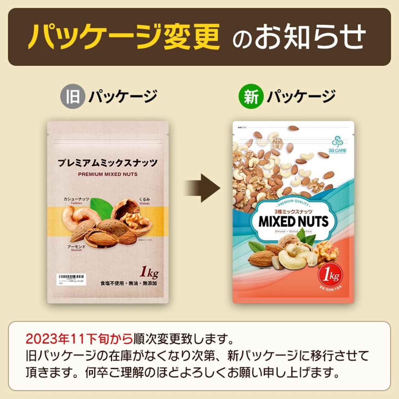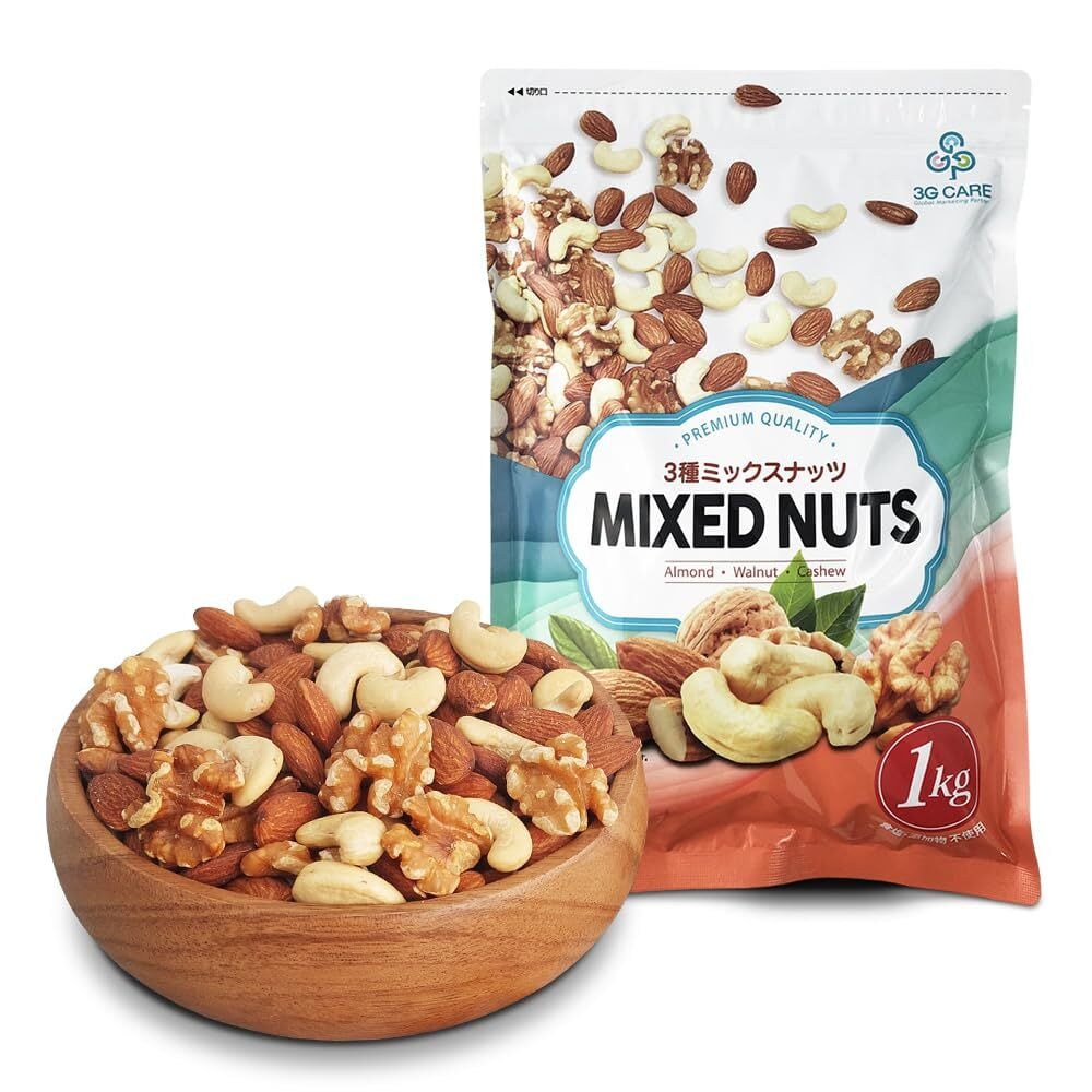 ミックスナッツ 3種類 1kg 徳用 生くるみ 素焼きアーモンド 素焼きカシューナッツ オイル不使用 無塩 無添加 / 3G CARE