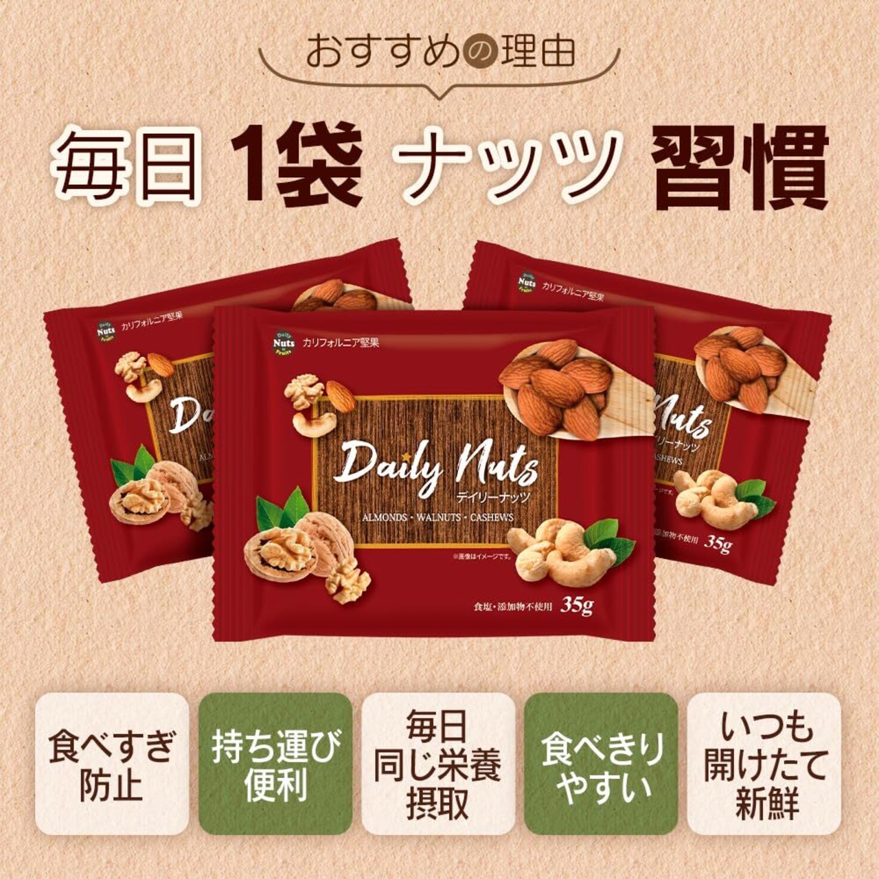 小分け3種 ミックスナッツ 1.05kg (35gx30袋) 産地直輸入 さらに小分け 箱入り 無塩 無添加 植物油不使用 (アーモンド等級:US Extra No.1) 防災食品 非常食 備蓄食 保存食