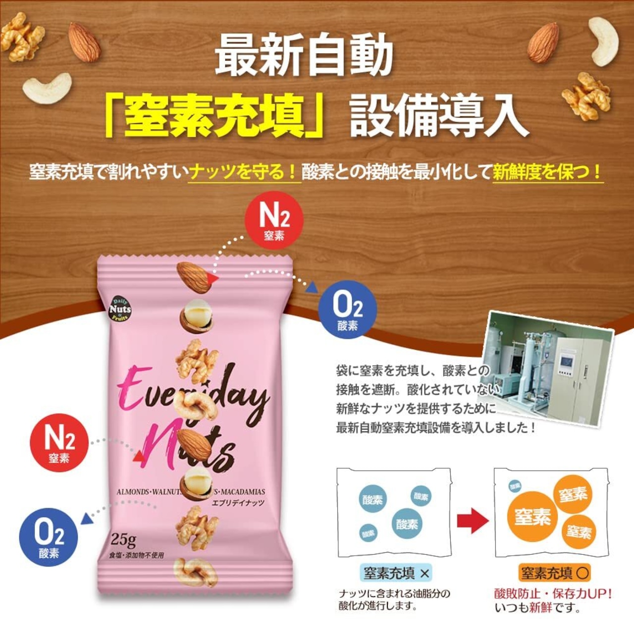 原材料名:アーモンド(アメリカ産)、くるみ(アメリカ産)、カシューナッツ(ベトナム産)、マカダミアナッツ(ケニア産)