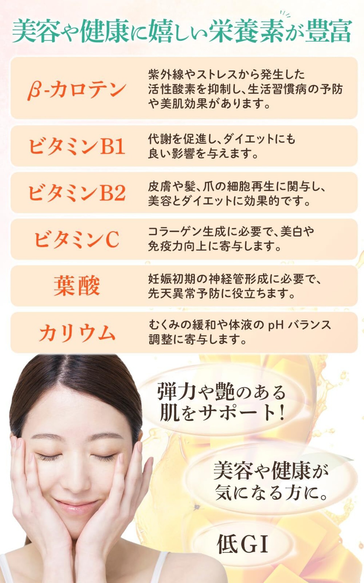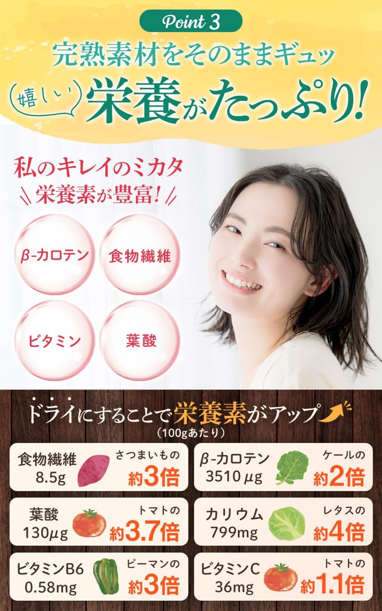 嬉しい栄養がたっぷり ドライにする事で栄養がアップ、食物繊維はさつまいもの3倍、葉酸はトマトの3.7倍、ビタミンB6はピーマンの3倍、β-カロテンはケールの2倍、カリウムはレタスの4倍、ビタミンCはトマトの1.1倍と他の野菜と比べても栄養満点です。