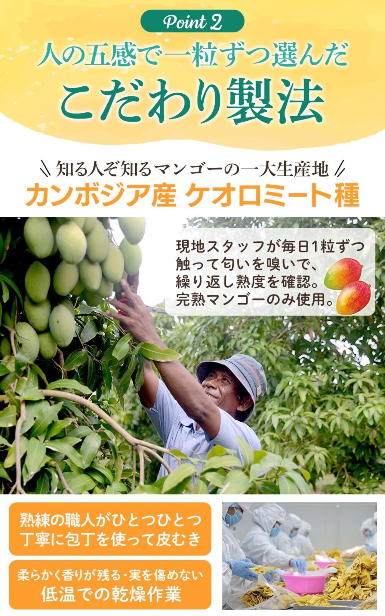 人の五感で一粒ずつ選んだこだわり製法 現地スタッフが毎日一粒ずつ触って匂いを嗅いで繰り返し熟度を確認した100%完熟マンゴー使用。柔らかく、香りが残り実を痛めない低温での乾燥作業をするこだわり製法