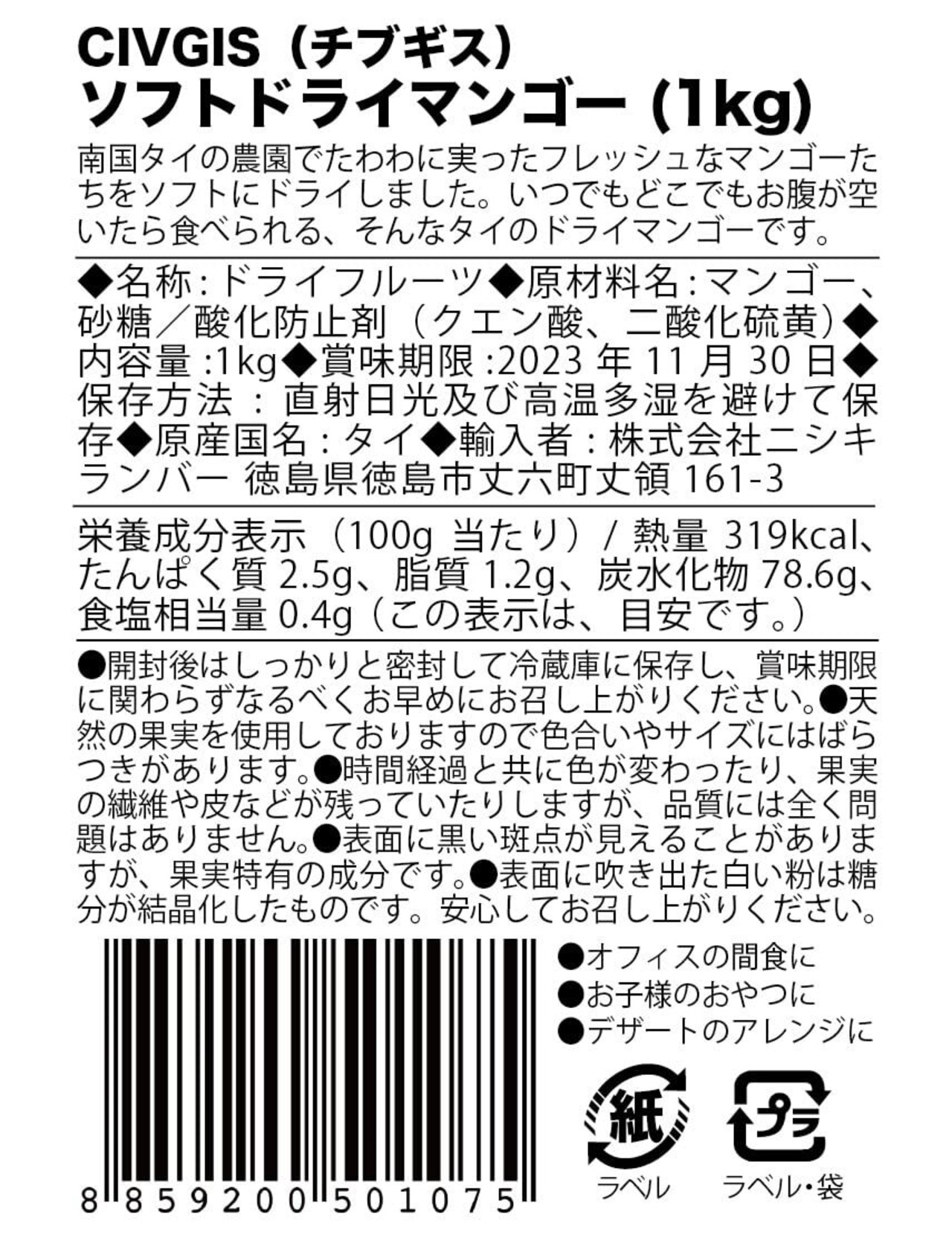 ✴️【マンゴースムージー】牛乳や豆乳と一緒にミキサーで砕けばとても美味しいマンゴースムージが作れます。 ✴️【お帰りマンゴー】ヨーグルトや牛乳などに浸しておくと生のマンゴーに近い食感になります。いわゆる「お帰りマンゴー」にピッタリのドライマンゴーです。 ✴️【マンゴー紅茶】小さく切って紅茶に入れるとマンゴーテイストなティータイムが楽しめます。 ✴️【マンゴーパン】加熱すると食感が柔らかくなるのでパン作りにピッタリのドライマンゴーです。 ✴️【お料理に追加】カットしてピザのトッピング、酢豚、エビチリなどに混ぜて使うと驚きの美味しさです。