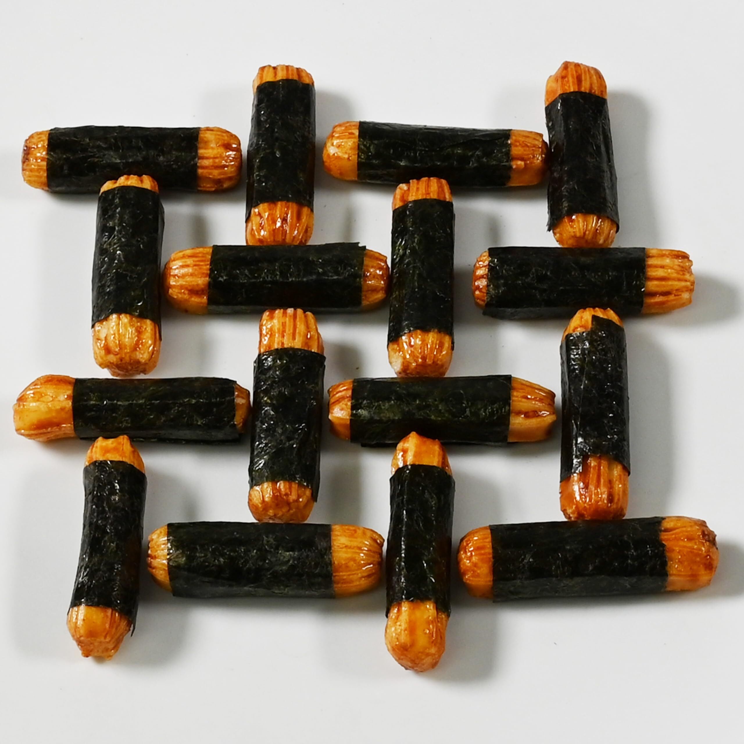 【原材料】米(中国)、醤油、海苔、砂糖、みりん、グルコースシロップ、魚介エキスパウダー、食塩/糊料(加工澱粉、キサンタンガム)、調味料(アミノ酸等)、着色料(カロチノイド、カラメル)、香辛料抽出物、酸味料(クエン酸)、(一部に小麦・さば・大豆・鶏肉を含む)