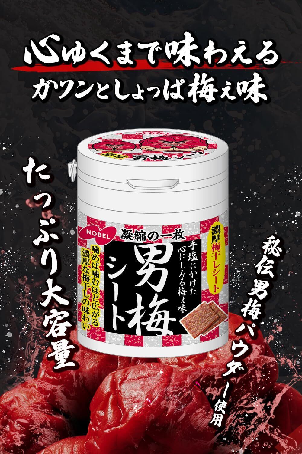 濃厚な梅干しの味わいが楽しめる「男梅」シリーズの中でも人気のある男梅シートにボトルタイプの商品が新登場しました! 男梅シリーズならではの噛めば噛むほどしみ出す濃厚な辛い梅の味わいが据え置きに便利な大容量ボトルで楽しめます。男梅蔵のキャラクターが登場するテレビCMも放映中!