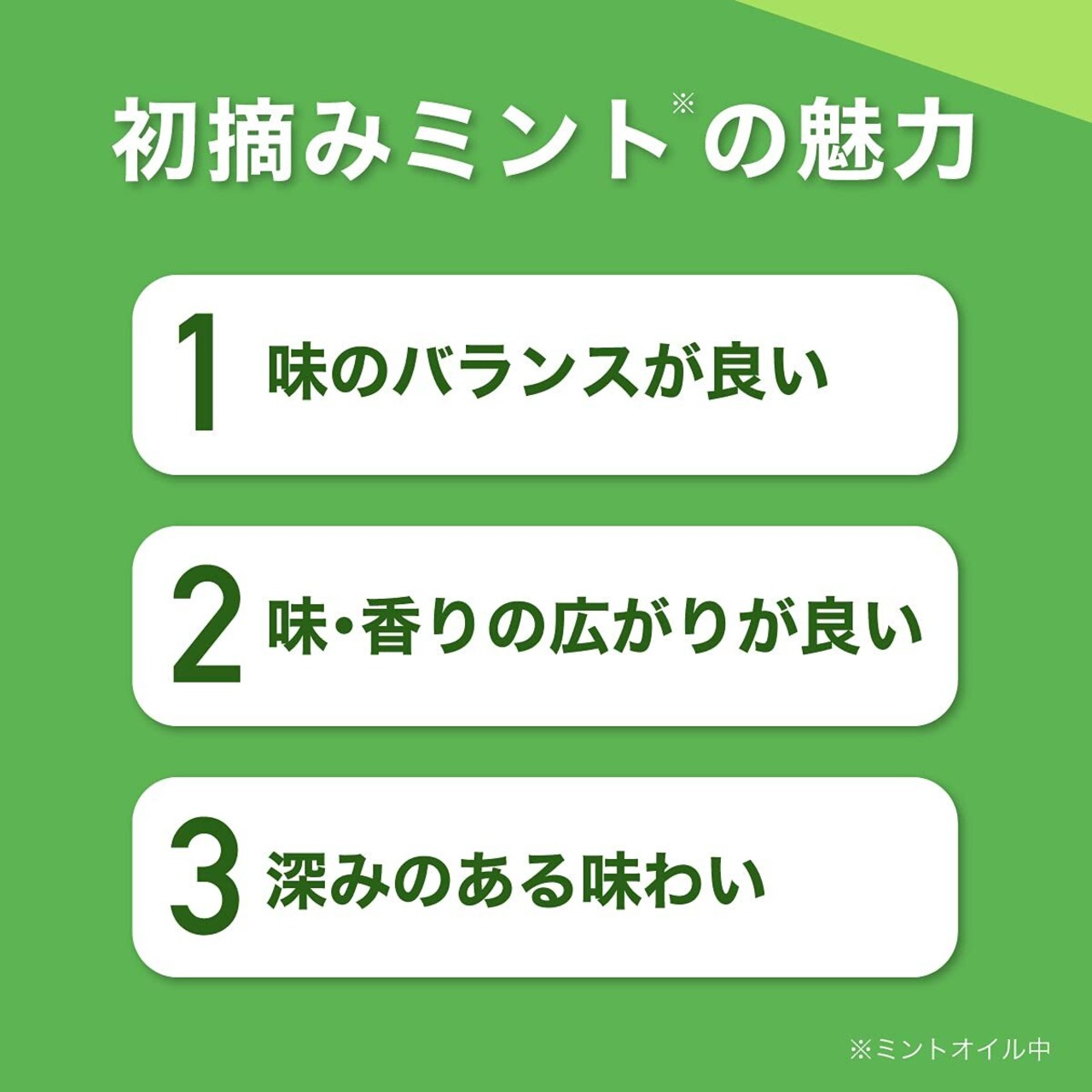 原材料:マルチトール(国内製造、中国製造)、エリスリトール、還元パラチノース、ゼラチン、乾燥ペパーミント、ウーロン茶抽出物/ガムベース、甘味料(キシリトール、アスパルテーム・L-フェニルアラニン化合物、アセスルファムK)、香料、軟化剤、着色料(銅葉緑素)