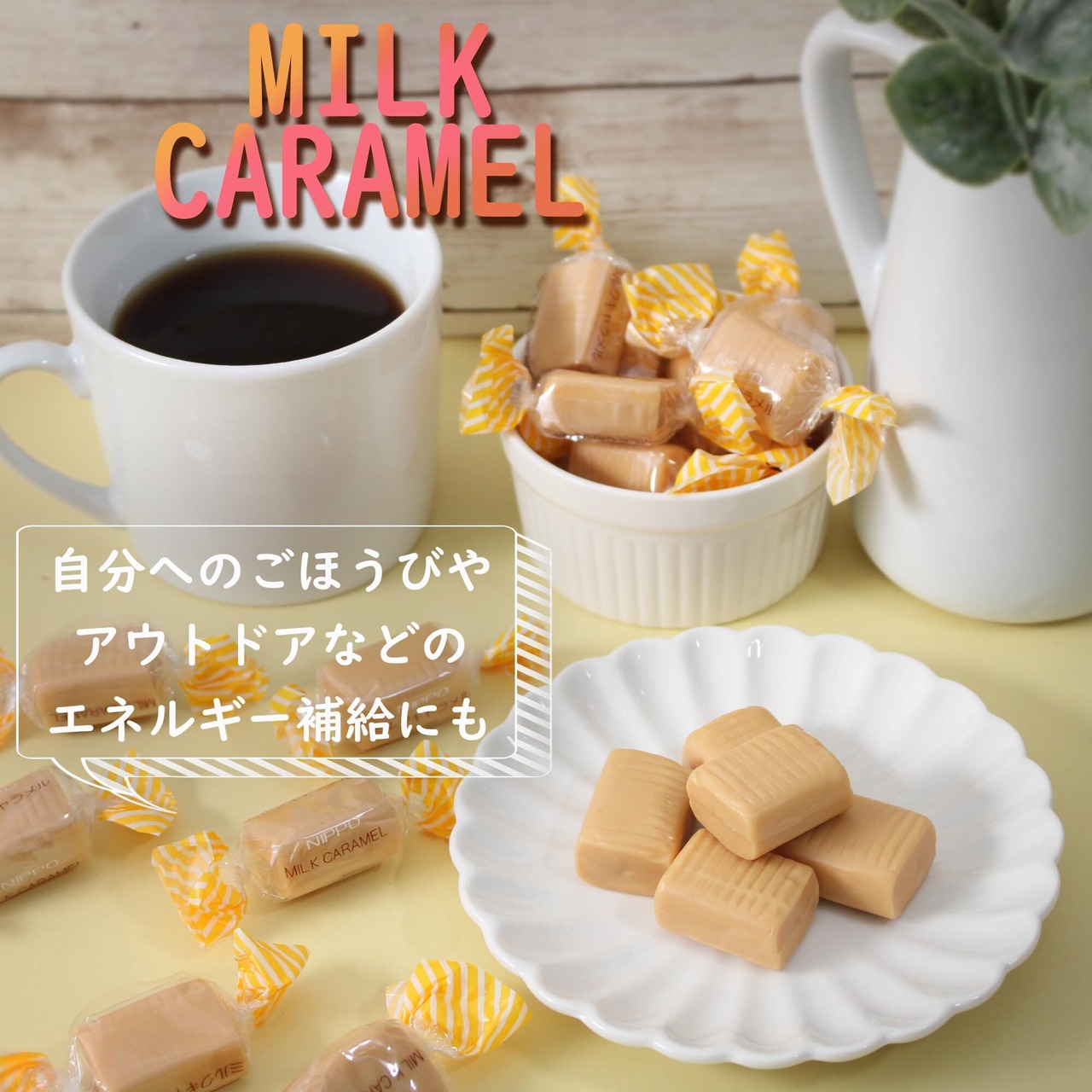 原材料:水飴、加糖れん乳、砂糖、植物油(パーム油)、小麦たんぱく、乳清カルシウム、ソルビット、乳化剤(大豆由来)、香料