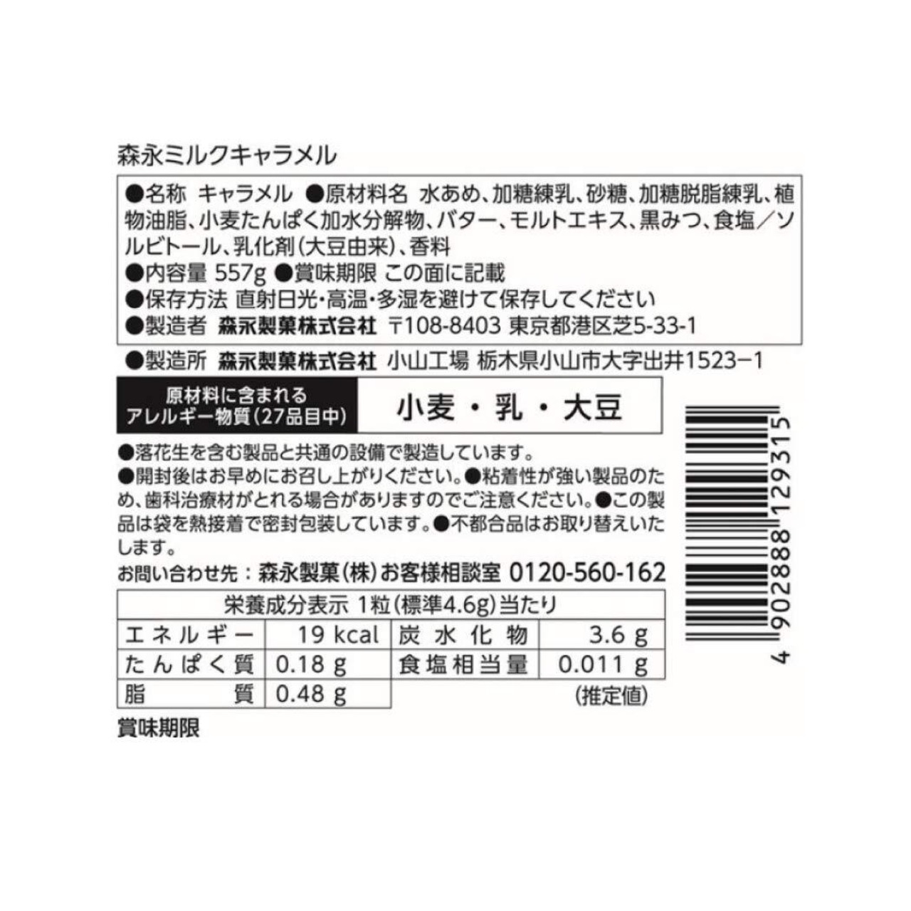 原材料:水あめ、加糖練乳、砂糖、加糖脱脂練乳、植物油脂、小麦たんぱく、バター、モルトエキス、黒みつ、食塩、ソルビ トール、乳化剤(大豆由来)、香料