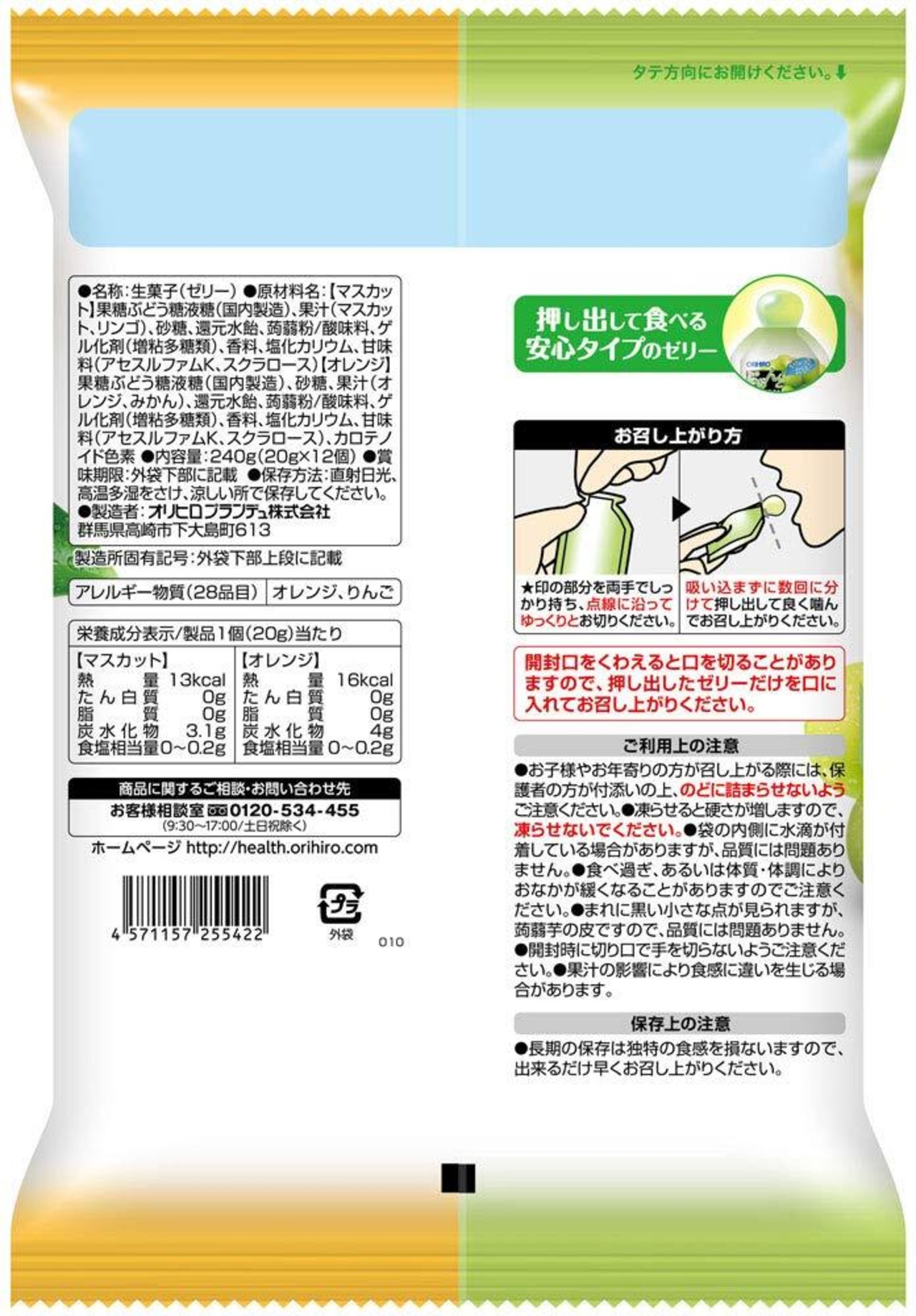 原材料:【マスカット】果糖ぶどう糖液糖、果汁(マスカット、リンゴ)、砂糖、還元水飴、蒟蒻粉/酸味料、ゲル化剤(増粘多糖類)、香料、塩化カリウム、甘味料(アセスルファムK、スクラロース)【オレンジ】果糖ぶどう糖液糖、砂糖、果汁(オレンジ、みかん)、還元水飴、蒟蒻粉/酸味料、ゲル化剤(増粘多糖類)、香料、塩化カリウム、甘味料(アセスルファムK、スクラロース)、カロチノイド色素