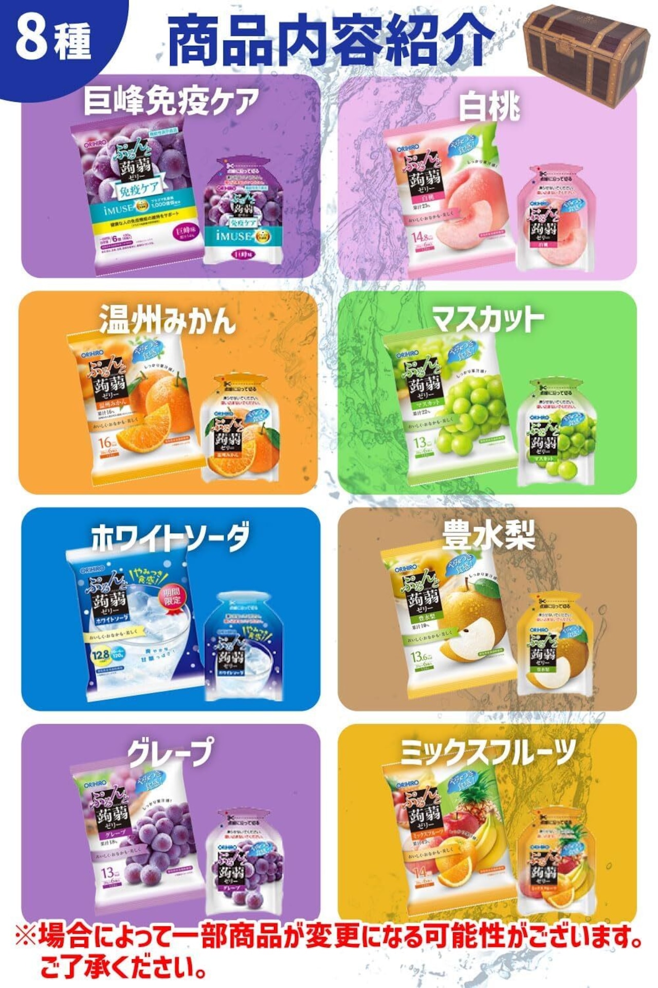 【8種類の味】グレープ(1個13kcal)、白桃(1個14.8kcal)、マスカット(1個13kcal)、温州みかん(1個16kcal)、プラズマ乳酸菌(巨峰)(1個14.6kcal)、ミックスフルーツ(1個14kcal)、豊水梨(1個13.6kcal)、ホワイトソーダ(1個12.8kcal) ※場合によって一部商品が変更になる可能性がございます。ご了承ください。