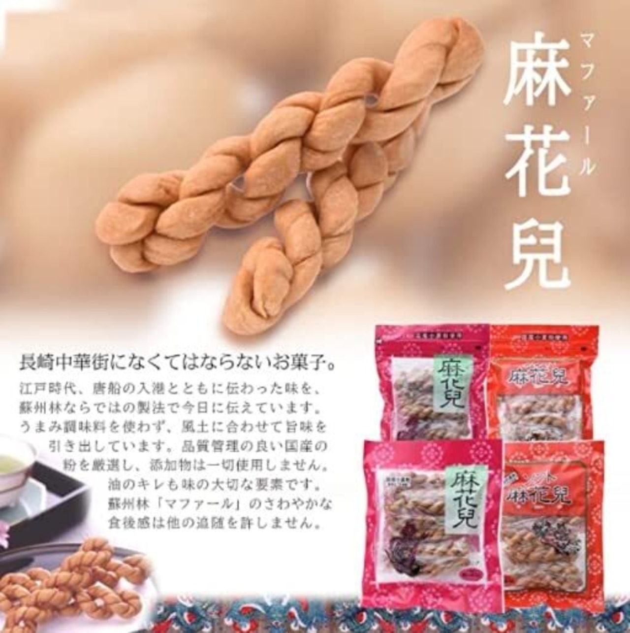 中国、特に北京を中心とした北部一帯で「麻花」という名で作られていたお菓子で、独特の風土性がにじみ出た自然の甘味を基調とした揚げ菓子です。
