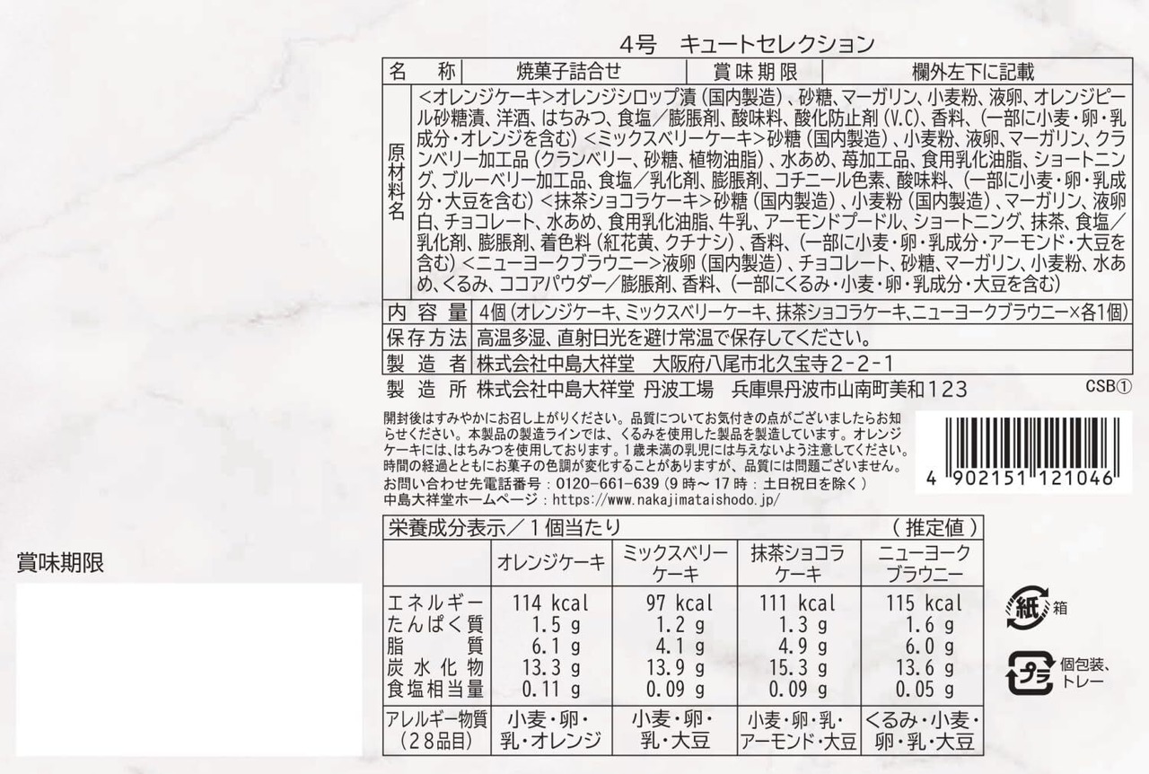 <オレンジケーキ>オレンジシロップ漬 (国内製造)、砂糖、マーガリン、 小麦粉、液卵、オレンジビール砂糖漬、洋酒、はちみつ、食塩/膨脹剤、酸味料、酸化防止剤(V.C)、香料、(一部に小麦・卵・乳成分・オレンジを含む)<ミックスベリーケーキ>砂糖(国内製造)、小麦粉、 液卵、マーガリン、クランベ リー加工品(クランベリー、砂糖、植物油脂)、水あめ、苺加工品、食用乳化油脂、 ショートニング、ブルーベリー加工品、食塩/乳化剤、膨脹剤、コチニール色素、酸味料、(一部に小麦・卵・乳成分・大豆を含む)<抹茶ショコラケーキ >砂糖 (国内製造)、小麦粉(国内製造)、マーガリン、液卵白、チョコレート、水あめ、食用乳化油脂、牛乳、アーモンドプードル、ショートニング、抹茶、食塩/乳化剤、膨脹剤、着色料(紅花黄、クチナシ)、香料、(一部に小麦・卵・乳成分・アーモンド・大豆を含む)<ニューヨークブラウニー>液卵 (国内製造)、チョコレート、砂糖、マーガリン、小麦粉、水あめ、くるみ、ココアパウダー/膨脹剤、香料、(一部にくるみ・小麦・卵・ 乳成分・大豆を含む)