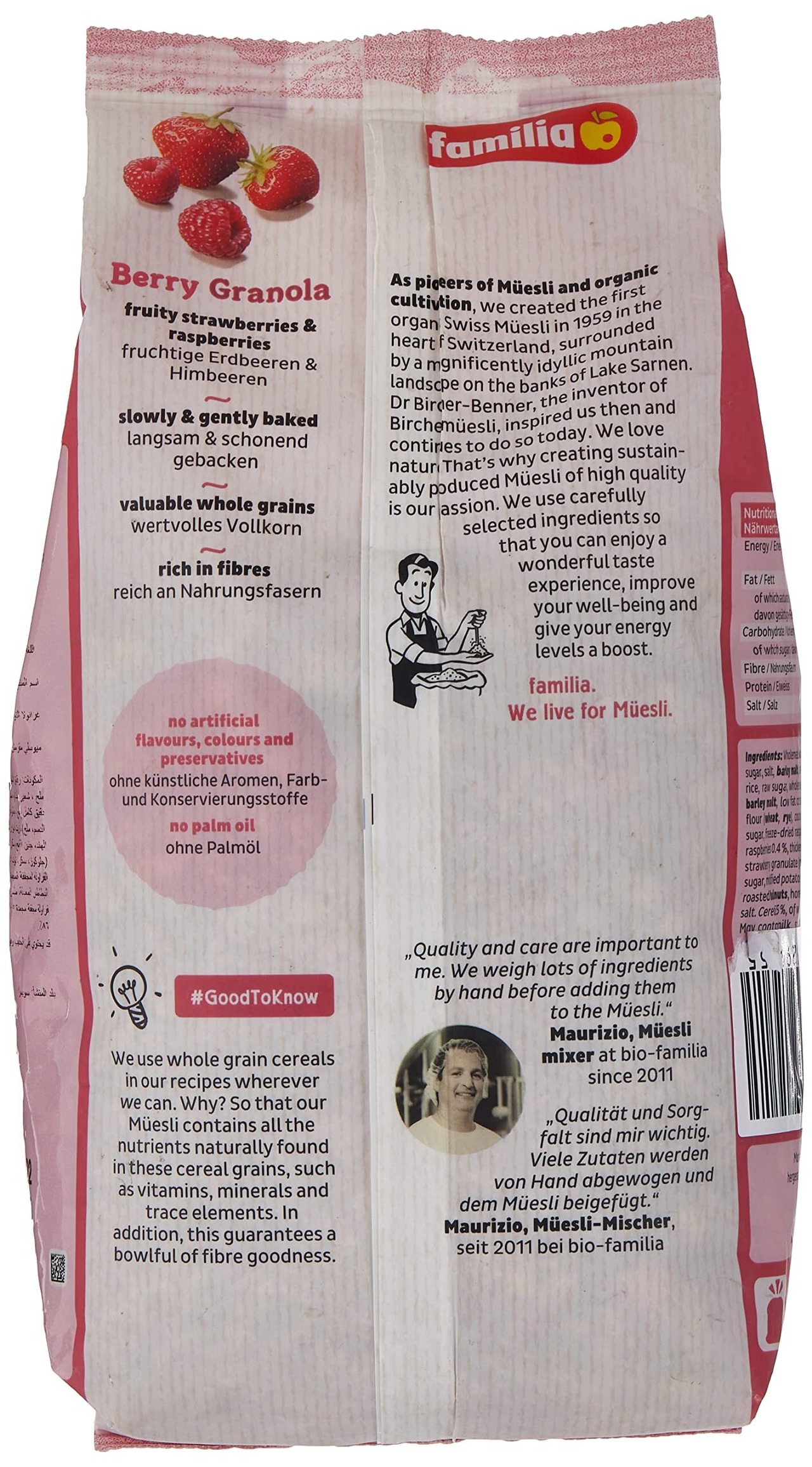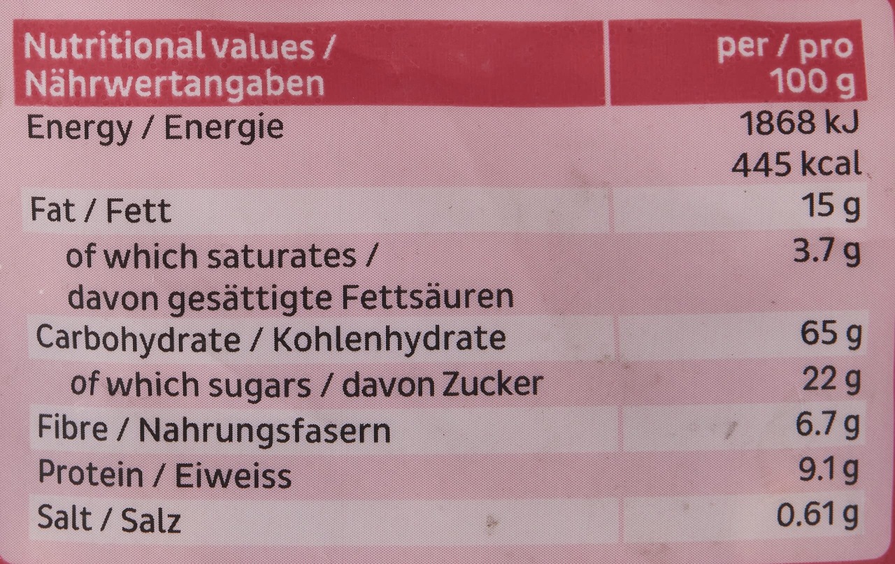 原材料:フレーク(オート麦、スペルト小麦)、粗糖、植物油、クリスプ(とうもろこし、米、大麦粉、大麦麦芽、ココアパウダー)、小麦粉、ライ麦粉、ココナッツフレーク、小麦胚芽、ぶどう糖、いちご、ラズベリー蜂蜜、へーゼルナッツ、食塩、砂糖、大麦麦芽、ぶどう糖液糖、マルトデキストリン、スターチ、乳化剤、増粘剤(アルギン酸Na)