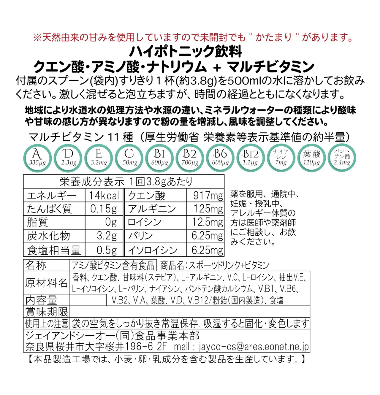 香料、クエン酸、甘味料(ステビア)、L-アルギニン、V.C、L-ロイシン、抽出V.E、L-イソロイシン、L-バリン、ナイアシン、パントテン酸カルシウム、V.B1、V.B6、V.B2、V.A、葉酸、V.D、V.B12/粉飴(国内製造)、食塩