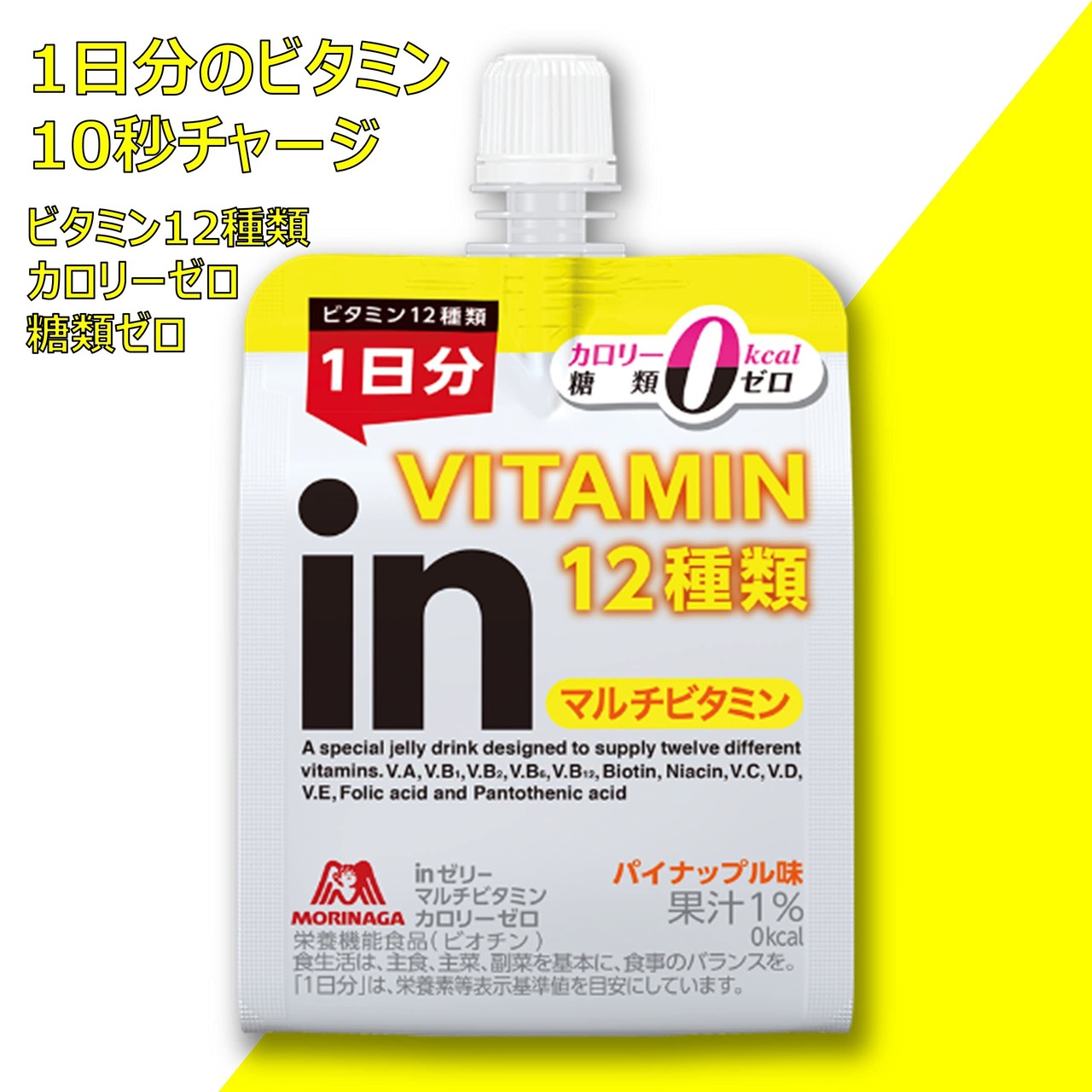 【カロリーゼロで1日分のビタミン10秒チャージ】「inゼリー」シリーズはおいしく素早く目的のエネルギーや栄養素・水分を補給できる、飲むゼリータイプの栄養補助食品です。●1日分のビタミン12種類を配合減量等で食事量を減らしている場合には、ビタミンの摂取量も減少する可能性があります。また、運動量の増加でビタミンの消費も増えるため、ビタミン不足の心配が。ビタミンは食事内容によっては不足しやすい栄養素ですが、1日分のビタミンを10秒チャージできます。●カロリーゼロ&糖類ゼロカロリーを気にせず気軽に小腹満たし出来るので、減量中にも適しています。●フレーバーすっきり飲めるパイナップル味。●飲用シーン(例):・小腹満たし、食事代わり、おやつに・食欲がないとき、予防に・野菜が苦手、外食が多い、生活が不規則など栄養バランスが偏りがちな方に・お肌のメンテナンス・美容に・いざというときの非常食に、ストックに