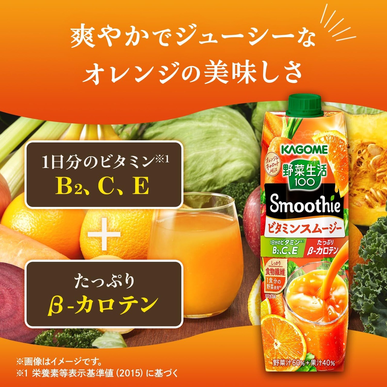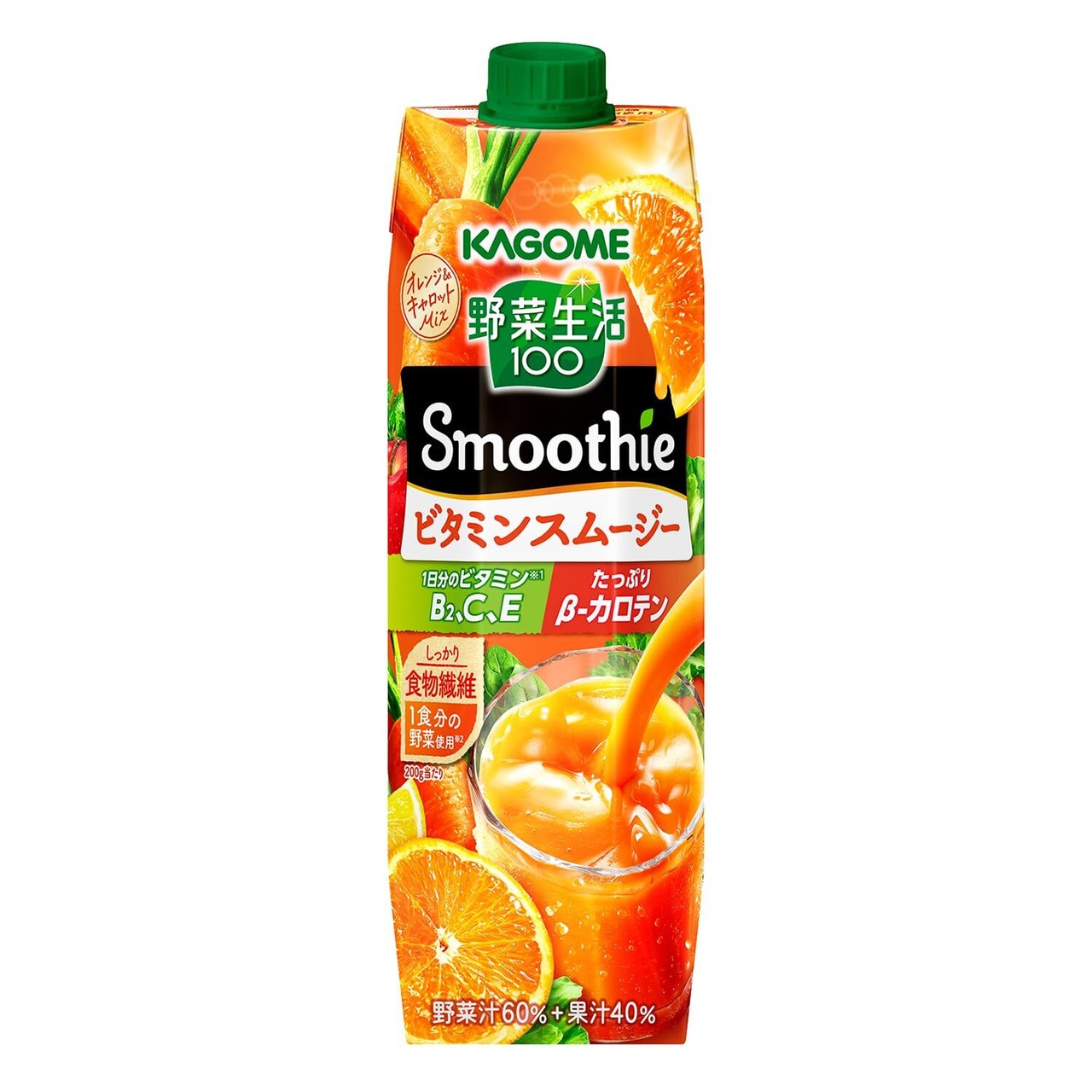 カゴメ 野菜生活100Smoothie ビタミンスムージー1000gは、1食分の野菜※1を使用し(200g当たり)、1日分※2のビタミンB2、C、Eと食物繊維がしっかり摂れる、濃厚スムージー。砂糖不使用で爽やかでジューシーなオレンジのおいしさです。野菜の栄養※3で元気をサポート ※1厚生労働省推進・健康日本21の目標値(1日350g)の約1/3である野菜120g分 〇野菜飲料は原料野菜の全成分を含むものではありませんが、不足しがちな野菜を補うためにお役立てください。※2栄養素等表示基準値(2015)に基づく ※3βーカロテン