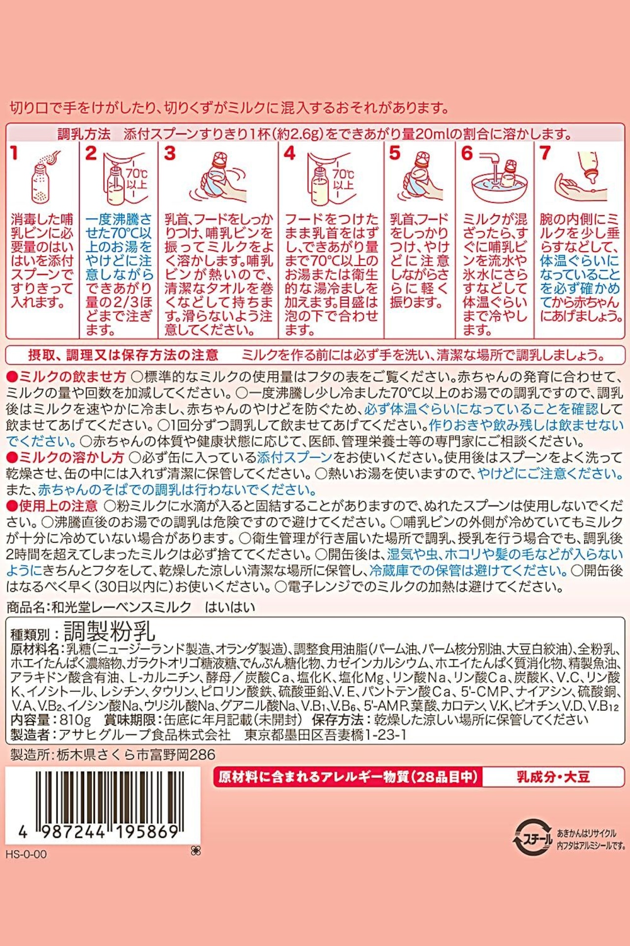 ■ミルクの飲ませ方〇標準的なミルクの使用量はフタの表をご覧ください。赤ちゃんの発育に合わせて、ミルクの量や回数を加減してください。○一度沸騰し少し冷ました70℃以上のお湯での調乳ですので、調乳後はミルクを速やかに冷まし、赤ちゃんのやけどを防ぐため、必ず体温ぐらいになっていることを確認して飲ませてあげてください。○1回分ずつ調乳して飲ませてあげてください。作りおきや飲み残しは飲ませないでください。○赤ちゃんの体質や健康状態に応じて、医師、管理栄養士等の専門家にご相談ください。■ミルクの溶かし方○必ず缶に入っている添付スプーンをお使いください。使用後はスプーンをよく洗って乾燥させ、缶の中には入れず清潔に保管してください。○熱いお湯を使いますので、やけどにご注意ください。また、赤ちゃんのそばでの調乳は行わないでください。