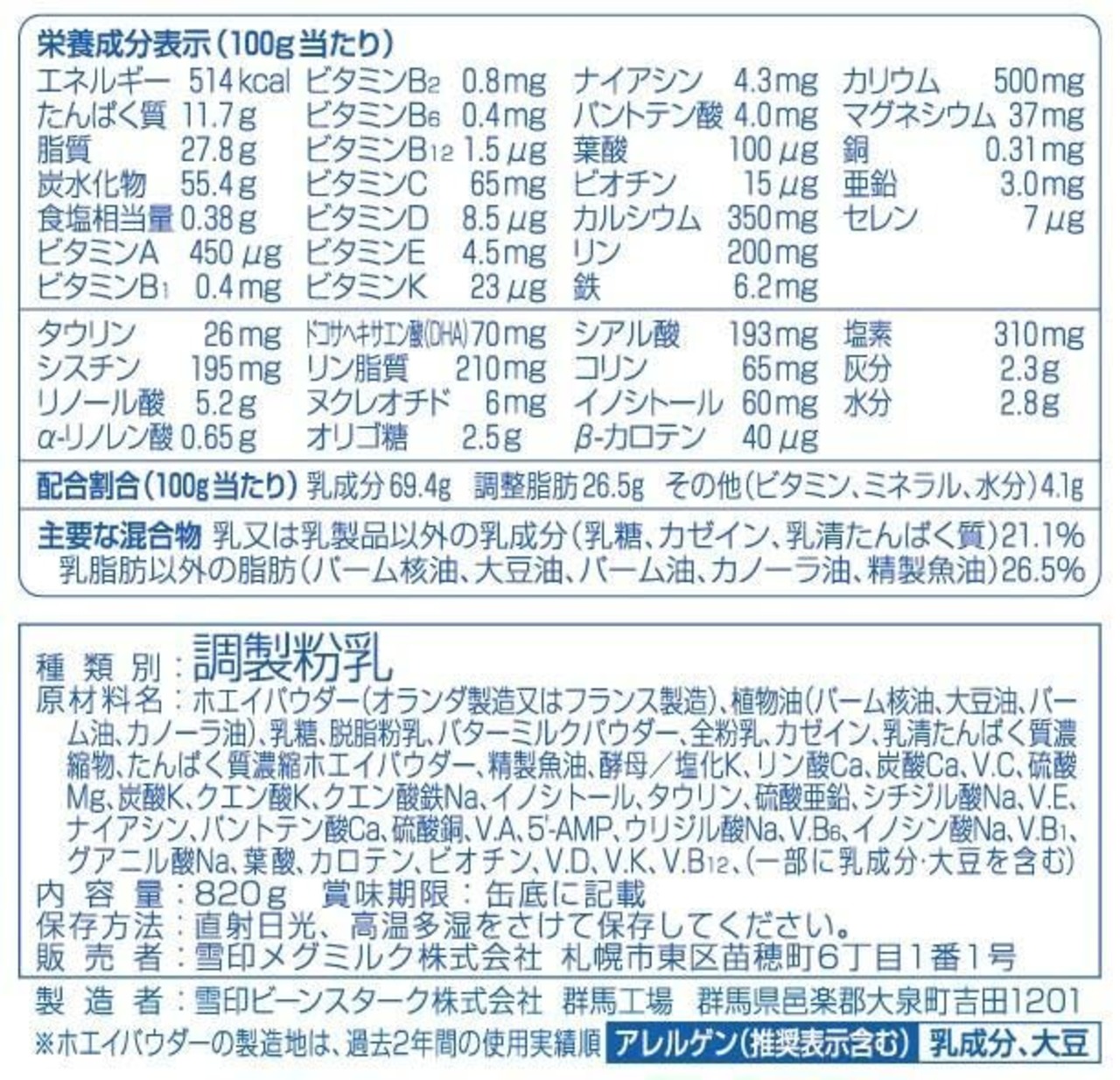 原材料:ホエイパウダー(オランダ製造又はフランス製造)、植物油(パーム核油、大豆油、パーム油、カノーラ油)、乳糖、脱脂粉乳、バターミルクパウダー、全粉乳、カゼイン、乳清たんぱく質濃縮物、たんぱく質濃縮ホエイパウダー、精製魚油、酵母/塩化K、リン酸Ca、炭酸Ca、V.C、硫酸Mg、炭酸K、クエン酸K、クエン酸鉄Na、イノシトール、タウリン、硫酸亜鉛、シチジル酸Na、V.E、ナイアシン、パントテン酸Ca、硫酸銅、V.A、5'-AMP、ウリジル酸Na、V.B6、イノシン酸Na、V.B1、グアニル酸Na、葉酸、カロテン、ビオチン、V.D、V.K、V.B12、(一部に乳成分・大豆を含む)