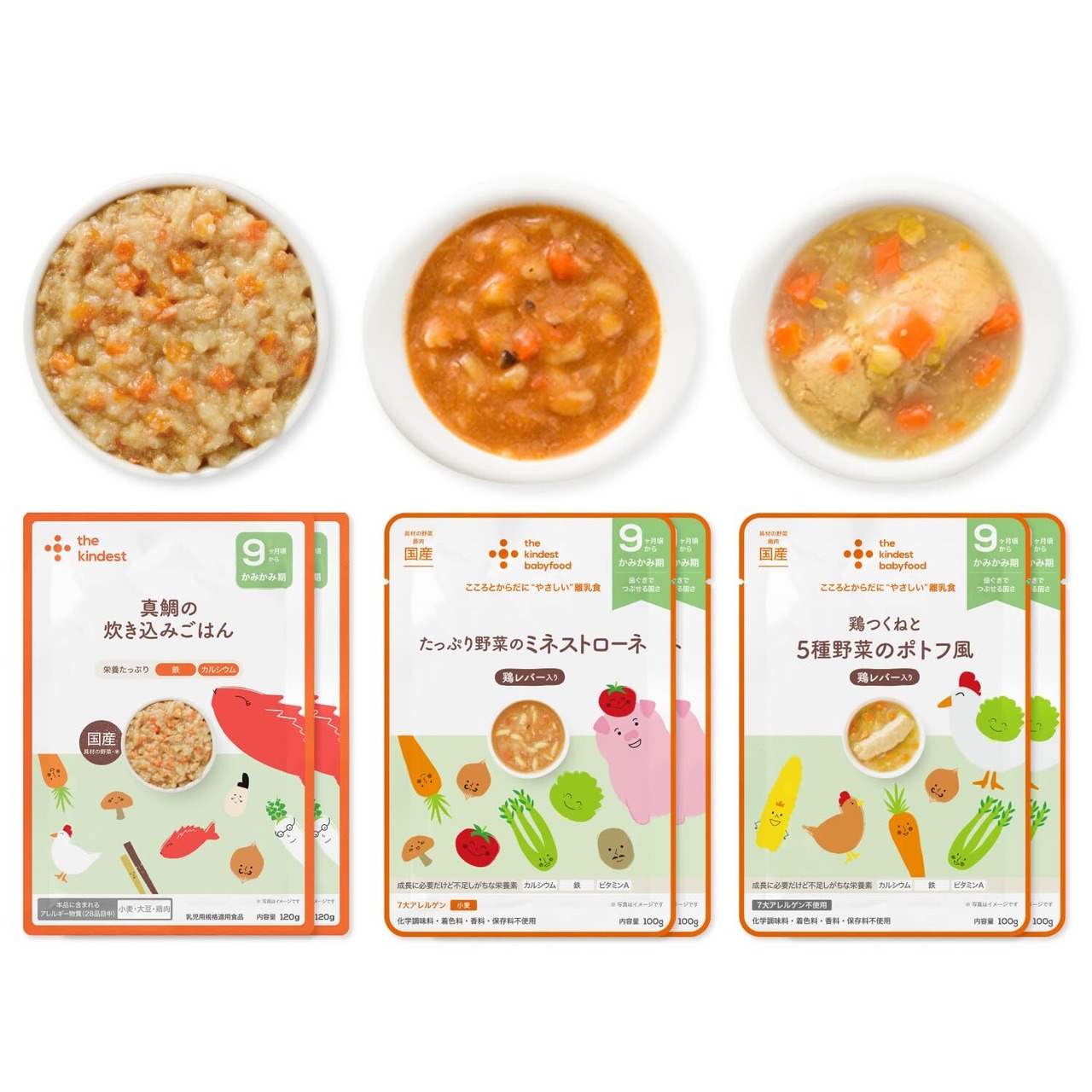 the kindest ( カインデスト )9ヶ月 離乳食セット(3種×2個)6袋セット (たっぷり野菜のミネストローネ/真鯛の炊き込みご飯/鶏つくねと5種野菜のポトフ風)