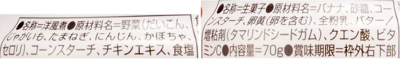 【バナナプリン】バナナ、砂糖、コーンスターチ、卵黄、全粉乳、バター、増粘剤(タマリンドシードガム)、クエン酸、ビタミンC 【角切り野菜ミックス】野菜(だいこん、じゃがいも、たまねぎ、にんじん、かぼちゃ、セロリー)、コーンスターチ、チキンエキス、食塩