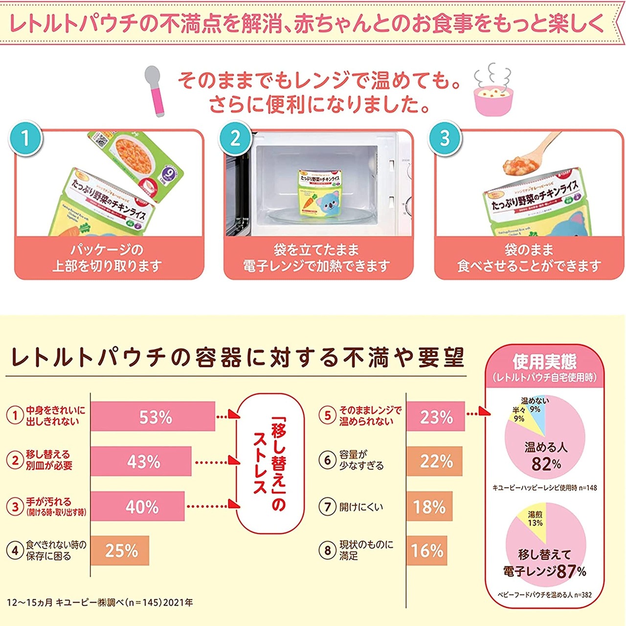 【キユーピー レンジでチンするハッピーレシピ 鶏五目ごはん】1袋(130g)当たり;エネルギー70Kcal,たんぱく質1.6g,脂質0.7g,炭水化物14.4g,食塩相当量0.3g【キユーピー レンジでチンするハッピーレシピ たっぷり野菜のチキントマトシチュー(レバー入り)】1袋(100g)当たり;エネルギー55Kcal,たんぱく質1.9g,脂質1.3g,炭水化物9g,食塩相当量0.4g