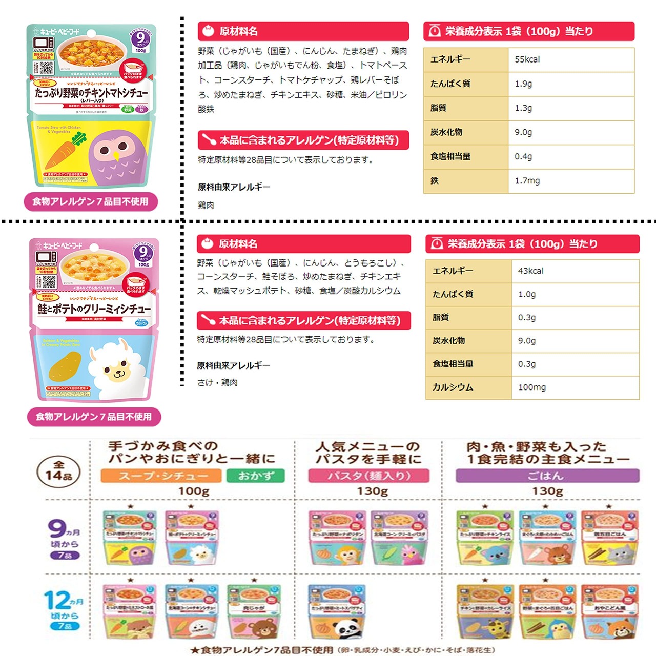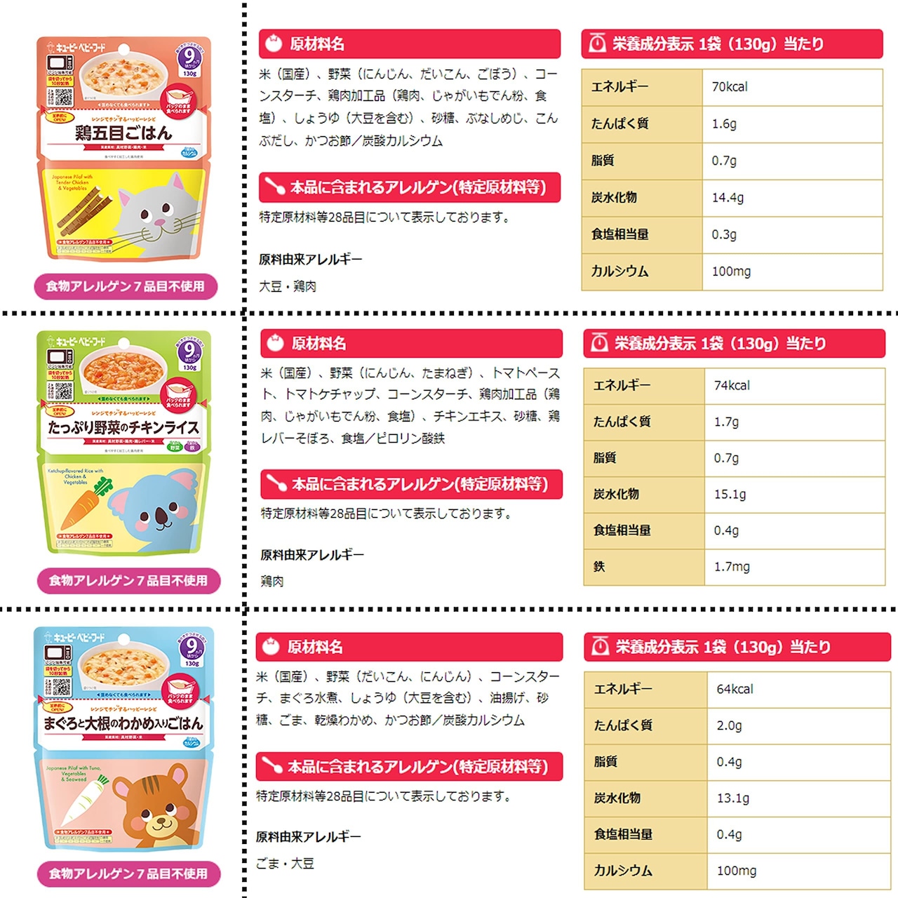 【キユーピー レンジでチンするハッピーレシピ たっぷり野菜のチキンライス】米(国産)、野菜(にんじん、たまねぎ)、トマトペースト、トマトケチャップ、コーンスターチ、鶏肉加工品(鶏肉、じゃがいもでん粉、食塩)、チキンエキス、砂糖、鶏レバーそぼろ、食塩/ピロリン酸鉄【キユーピー レンジでチンするハッピーレシピ まぐろと大根のわかめ入りごはん】米(国産)、野菜(だいこん、にんじん)、コーンスターチ、まぐろ水煮、しょうゆ(大豆を含む)、油揚げ、砂糖、ごま、乾燥わかめ、かつお節/炭酸カルシウム【キユーピー レンジでチンするハッピーレシピ 鶏五目ごはん】米(国産)、野菜(にんじん、だいこん、ごぼう)、コーンスターチ、鶏肉加工品(鶏肉、じゃがいもでん粉、食塩)、しょうゆ(大豆を含む)、砂糖、ぶなしめじ、こんぶだし、かつお節/炭酸カルシウム【キユーピー レンジでチンするハッピーレシピ たっぷり野菜のチキントマトシチュー(レバー入り)】野菜(じゃがいも(国産)、にんじん、たまねぎ)、鶏肉加工品(鶏肉、じゃがいもでん粉、食塩)、トマトペースト、コーンスターチ、トマトケチャップ、鶏レバーそぼろ、炒めたまねぎ、チキンエキス、砂糖、米油/ピロリン酸鉄【キユーピー レンジでチンするハッピーレシピ 鮭とポテトのクリーミィシチュー】野菜(じゃがいも(国産)、にんじん、とうもろこし)、コーンスターチ、鮭そぼろ、炒めたまねぎ、チキンエキス、乾燥マッシュポテト、砂糖、食塩/炭酸カルシウム