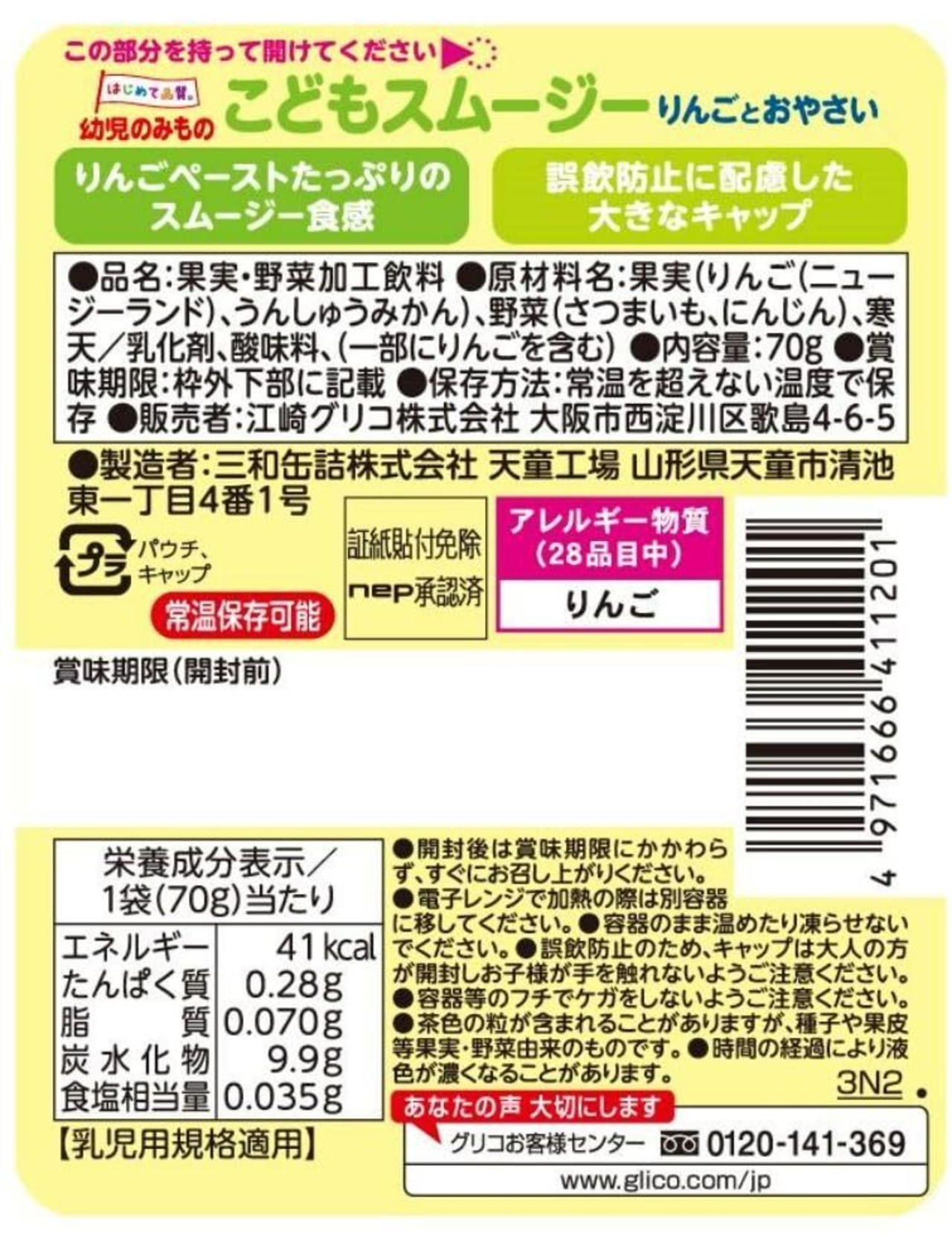 原材料:野菜(さつまいも、にんじん)、果実(りんご、うんしゅうみかん)、寒天/乳化剤、クエン酸、(一部にりんごを含む)