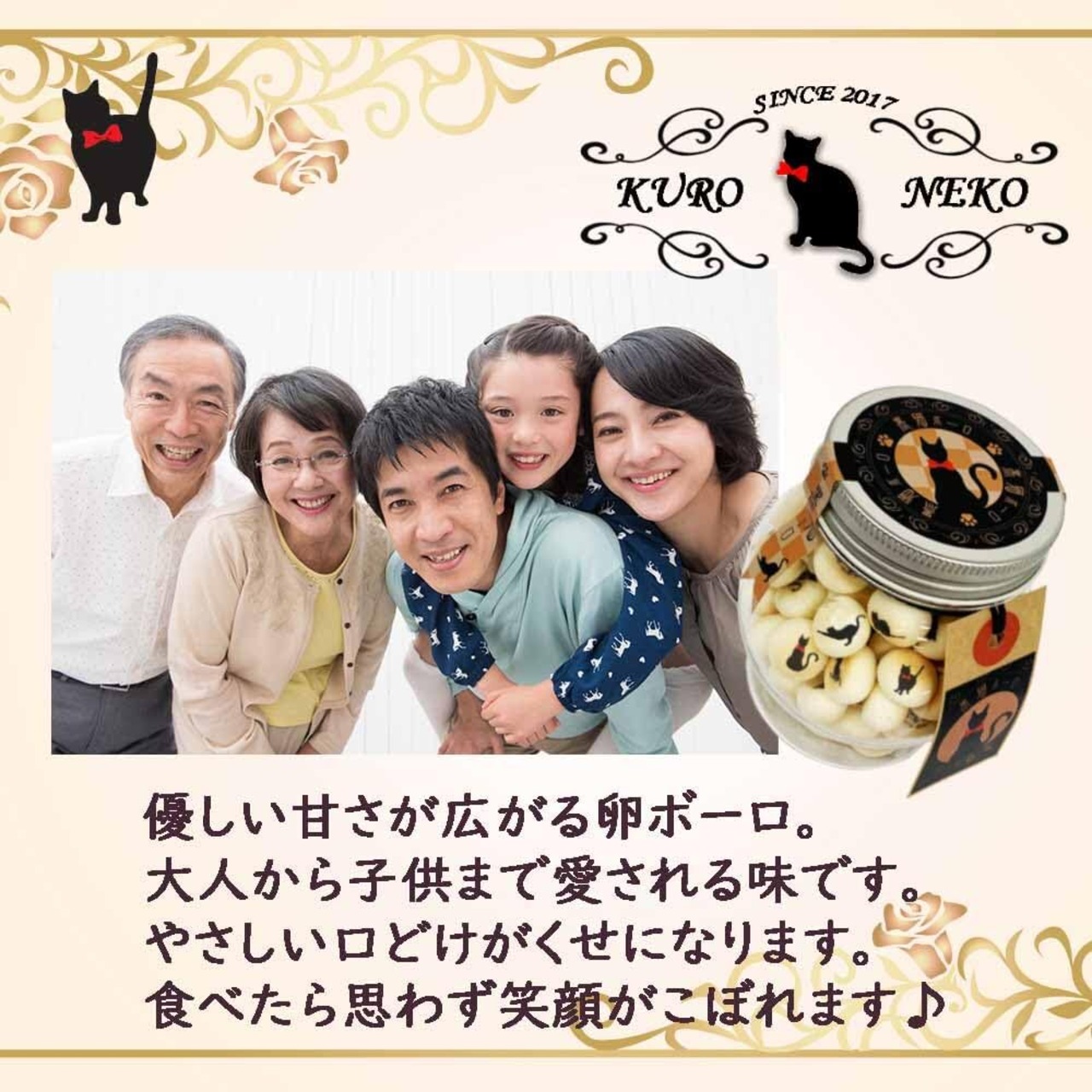 レトロでモダンな10種類のかわいい黒猫イラストが、ボーロにひとつぶひとつぶ描かれたとっても可愛いたまごボーロです。