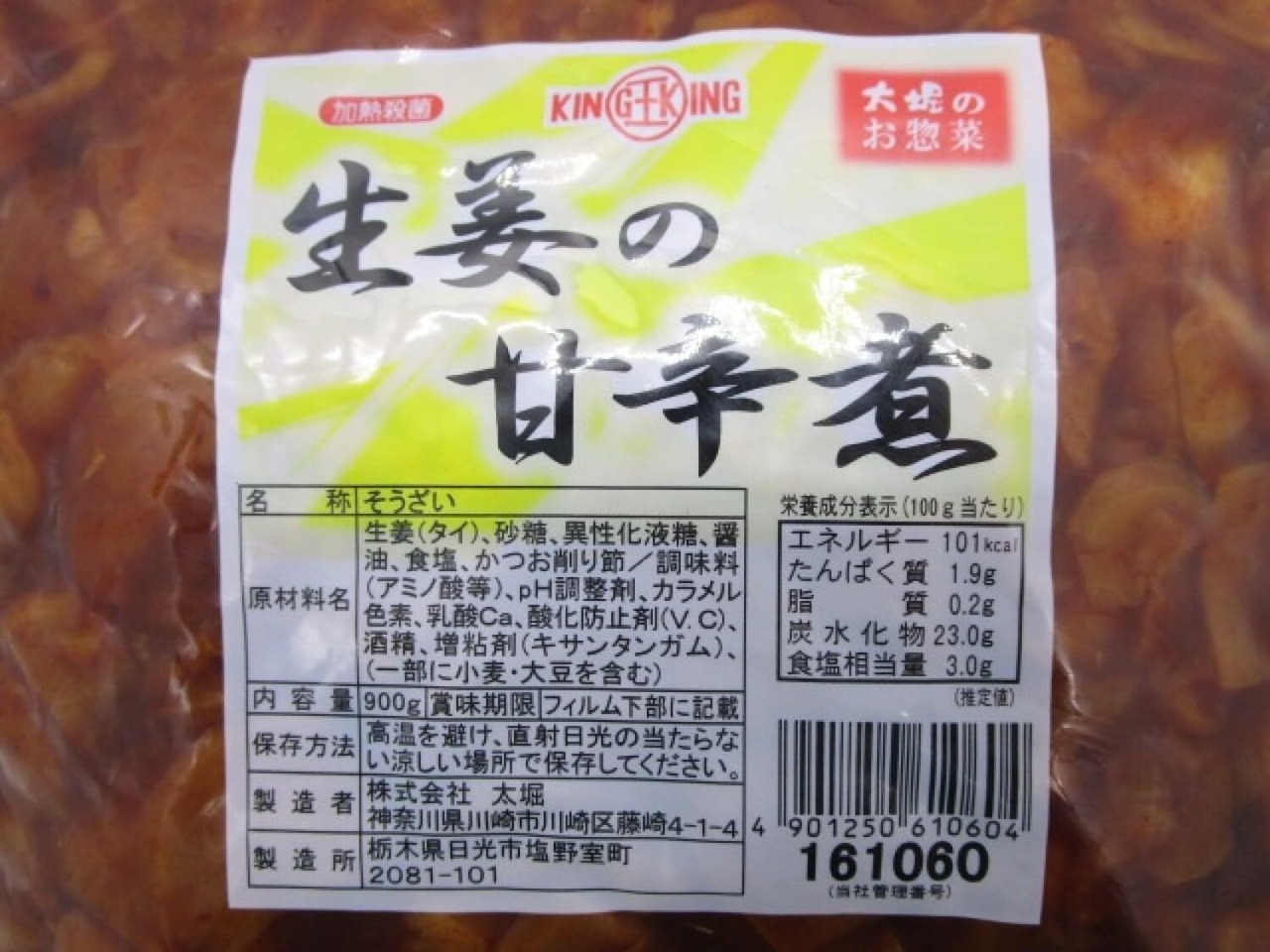 原材料:生姜(タイ)、砂糖、異性化液糖、醤油、食塩、かつお削り節/調味料(アミノ酸等)、pH調整剤、カラメル色素、乳酸Ca、酸化防止剤(V.C)、酒精、増粘剤(キサンタンガム)、(一部に小麦・大豆を含む)
