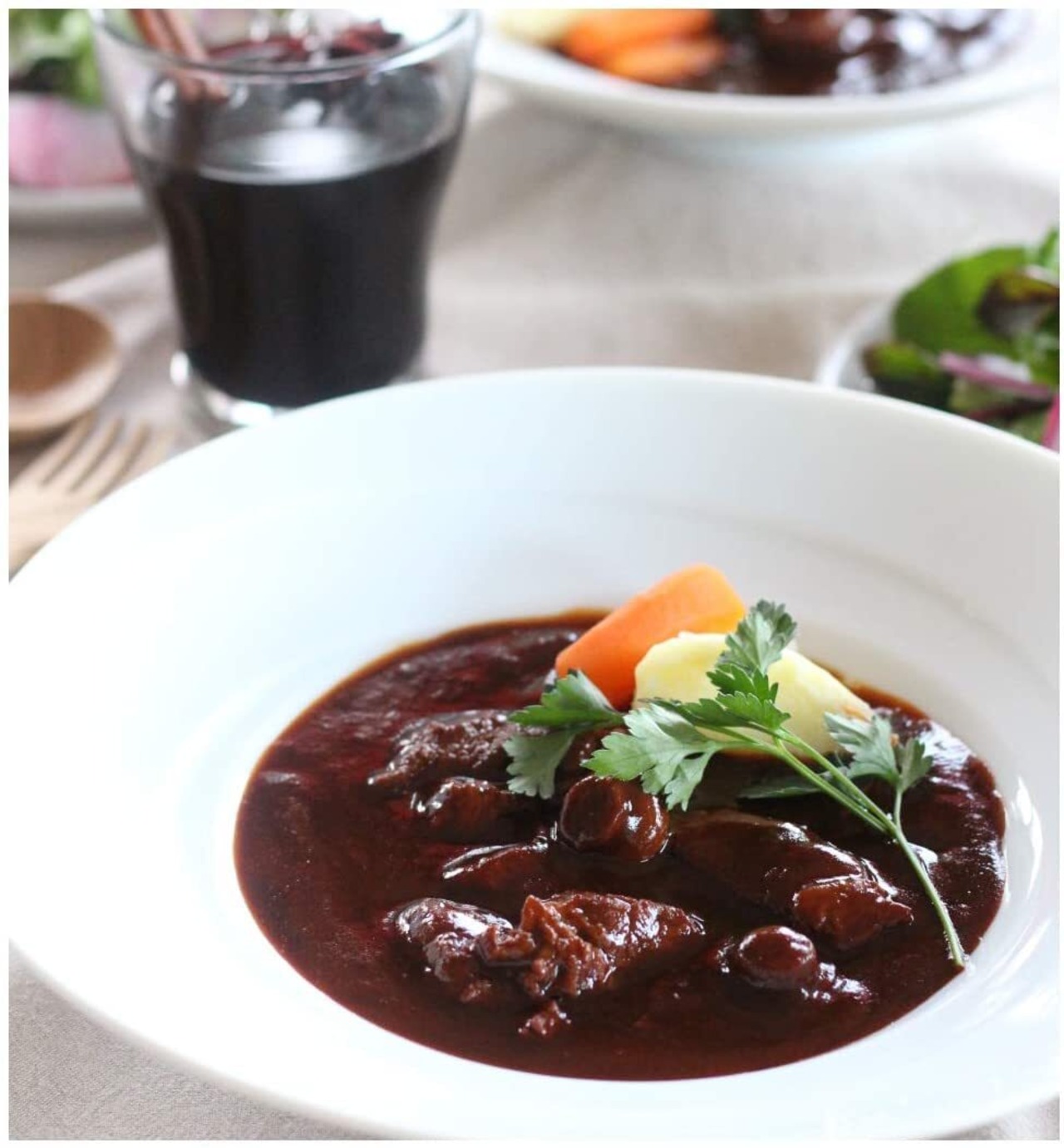 【じっくり煮込んだ本格的な味わい】 深みのある色合いのソースは、さらりとした口当たりの中にも程よい酸味と豊かな香り、牛肉や野菜の旨みがしっかり感じられます。