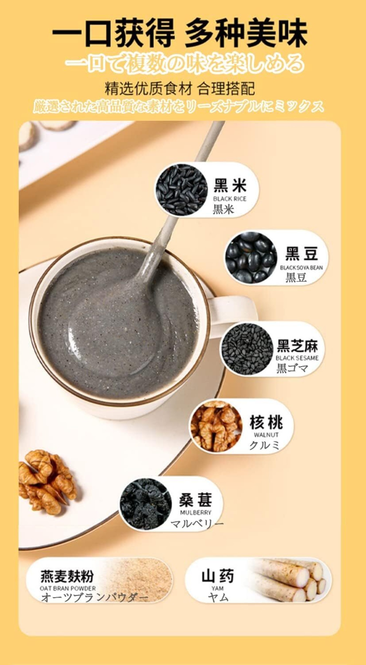 【厳選素材】黒米は黒くつややかで、細長くふくよか、米粒はなめらかで半透明、唇に香ばしさが残る、黒豆は黒く丸くつややかで栄養豊富、黒ごまは粒がそろっていてごまの香りが豊か、くるみは大きくふくよか、手挽き、まろやかな味と繊細なシルキー感がある、です。