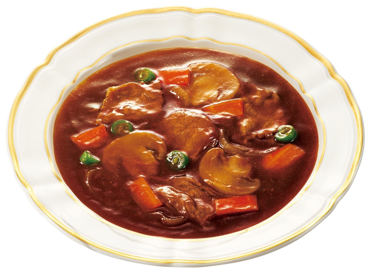 牛肉(オーストラリア)、マッシュルーム、オニオンソテー、ハヤシルウ、加工黒糖液、ビーフエキス調味料、にんじん、さやいんげん、オニオンエキス、植物油脂、果実酒、ビーフエキス、ローストオニオンペースト、クリーム、脱脂粉乳、発酵調味料、トマトペースト、香辛料、ブイヨン風調味料、食塩、フォンドヴォー、還元水あめ、酵母エキスパウダー/増粘剤(加工デンプン)、甘味料(トレハロース)、調味料(アミノ酸等)、カラメル色素、酸味料、重曹、酸化防止剤(ビタミンE、ビタミンC)、香辛料抽出物、(一部に小麦・乳成分・牛肉・大豆・鶏肉・豚肉・ゼラチンを含む)